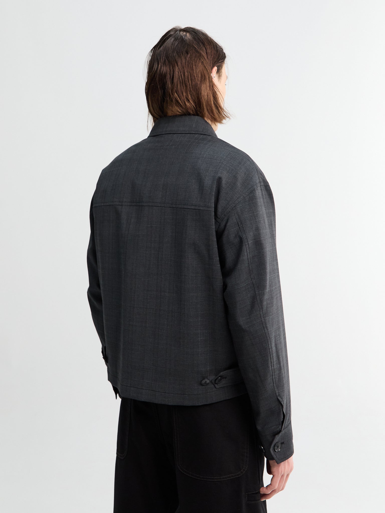 A relaxed wool blend jacket with dropped shoulders, two-way zip, and side pockets. Features a textured crepe finish in a fine check pattern in dark grey.