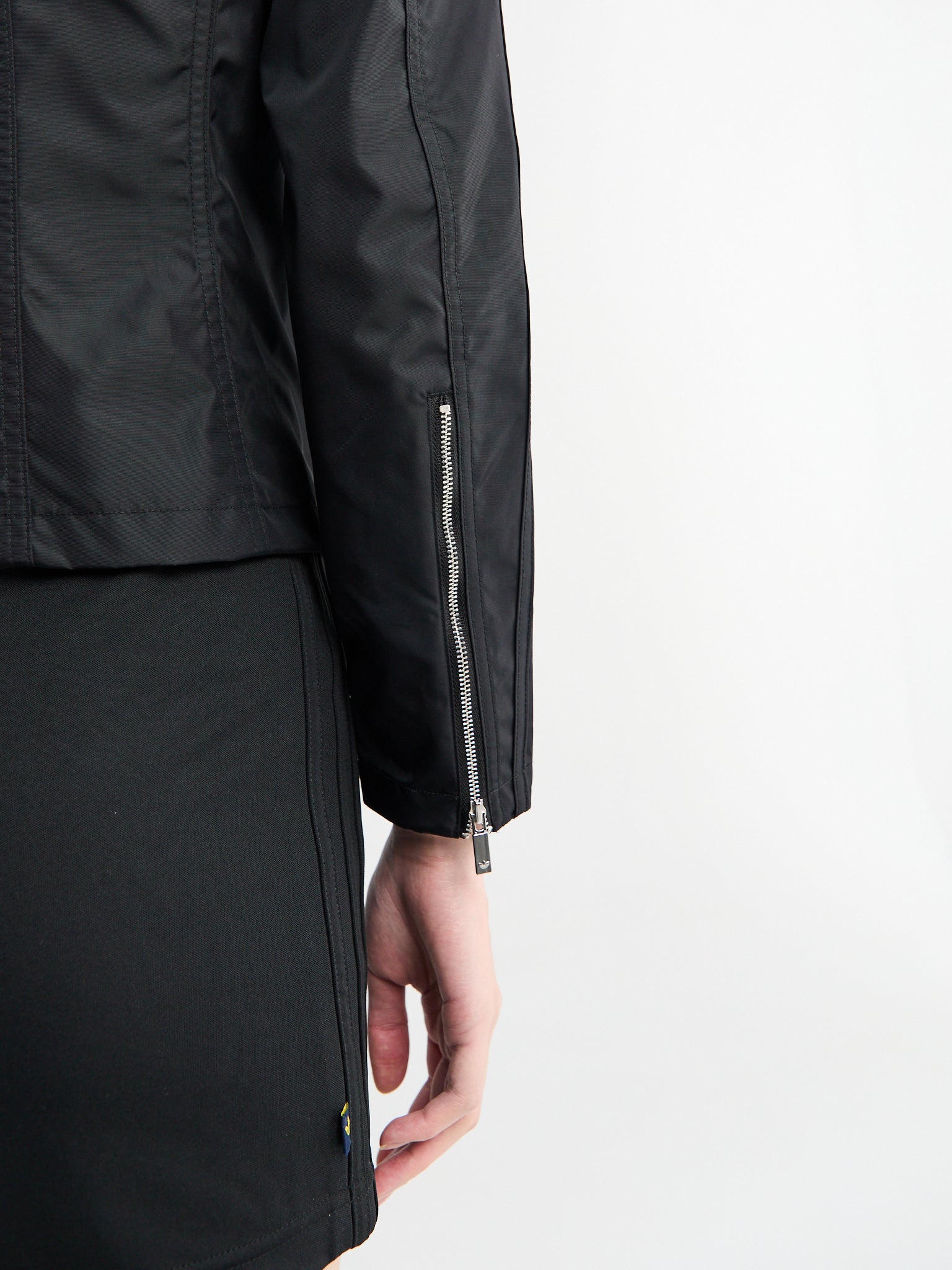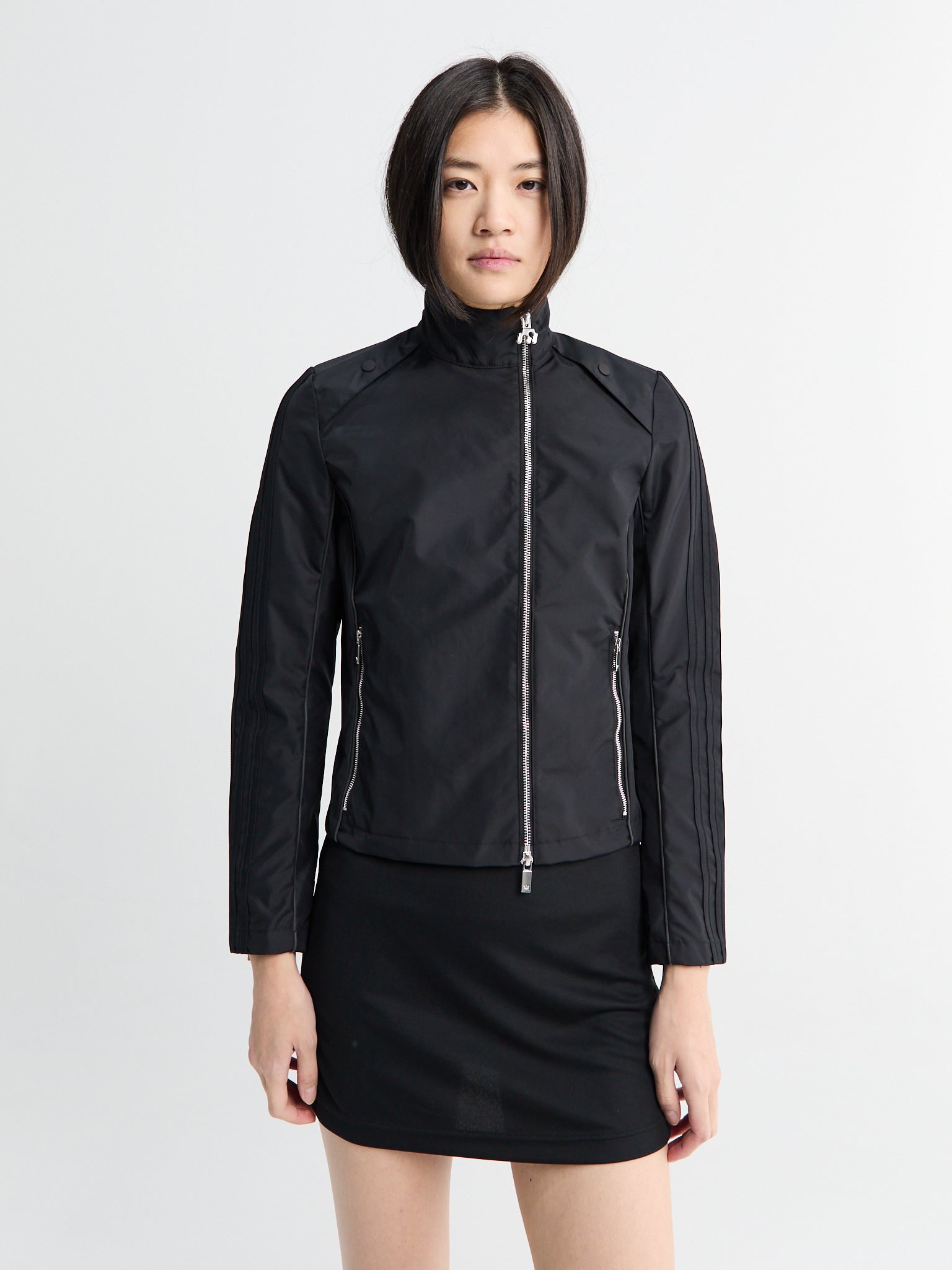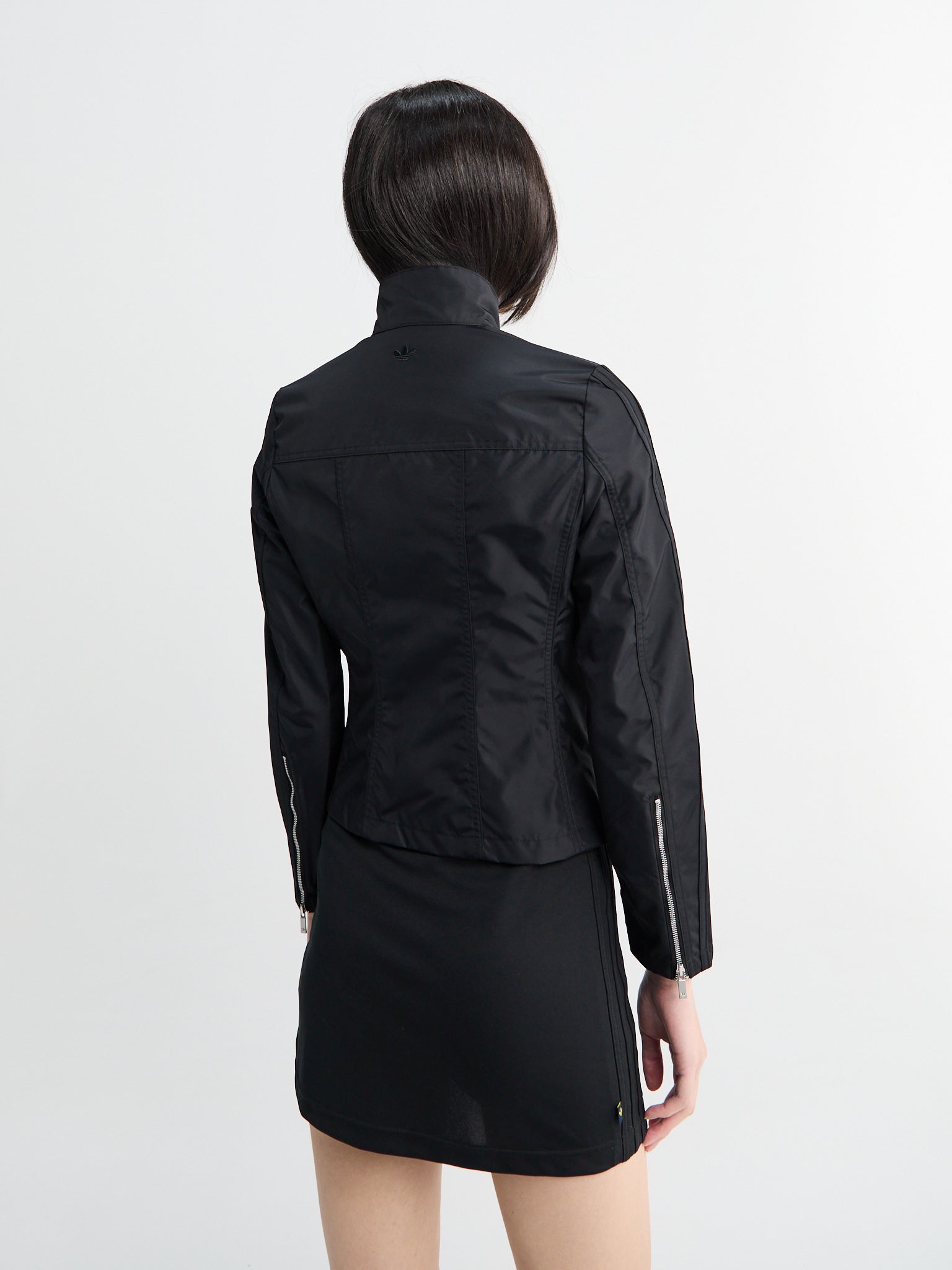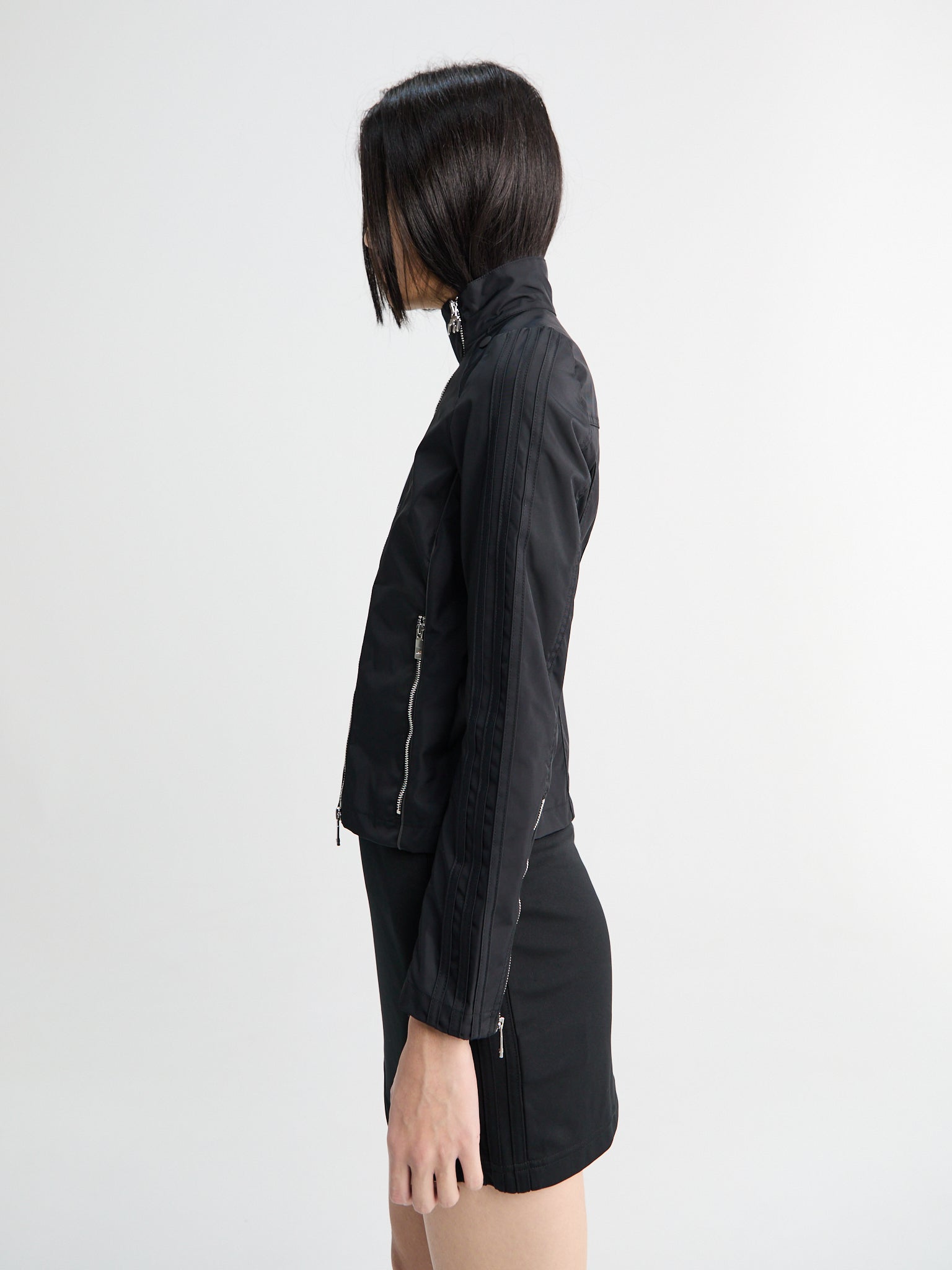 This black track top jacket merges modern aesthetics with functional durability. The fitted silhouette provides a streamlined look while allowing natural movement. The structured design offers a polished appearance that stands apart from standard basics.