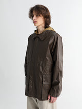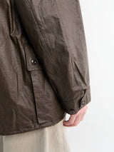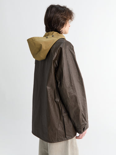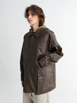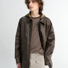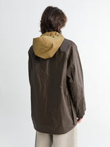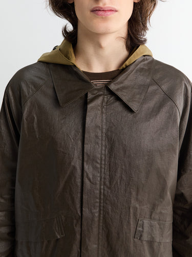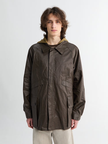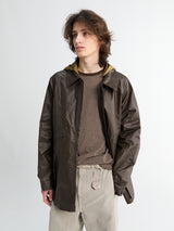 This rain jacket is cut from a water-repellent technical fabric in a distinctive bronze hue. It is designed with a straight silhouette and features a convertible collar, a concealed button placket, and a fully detachable hood for adaptable coverage.