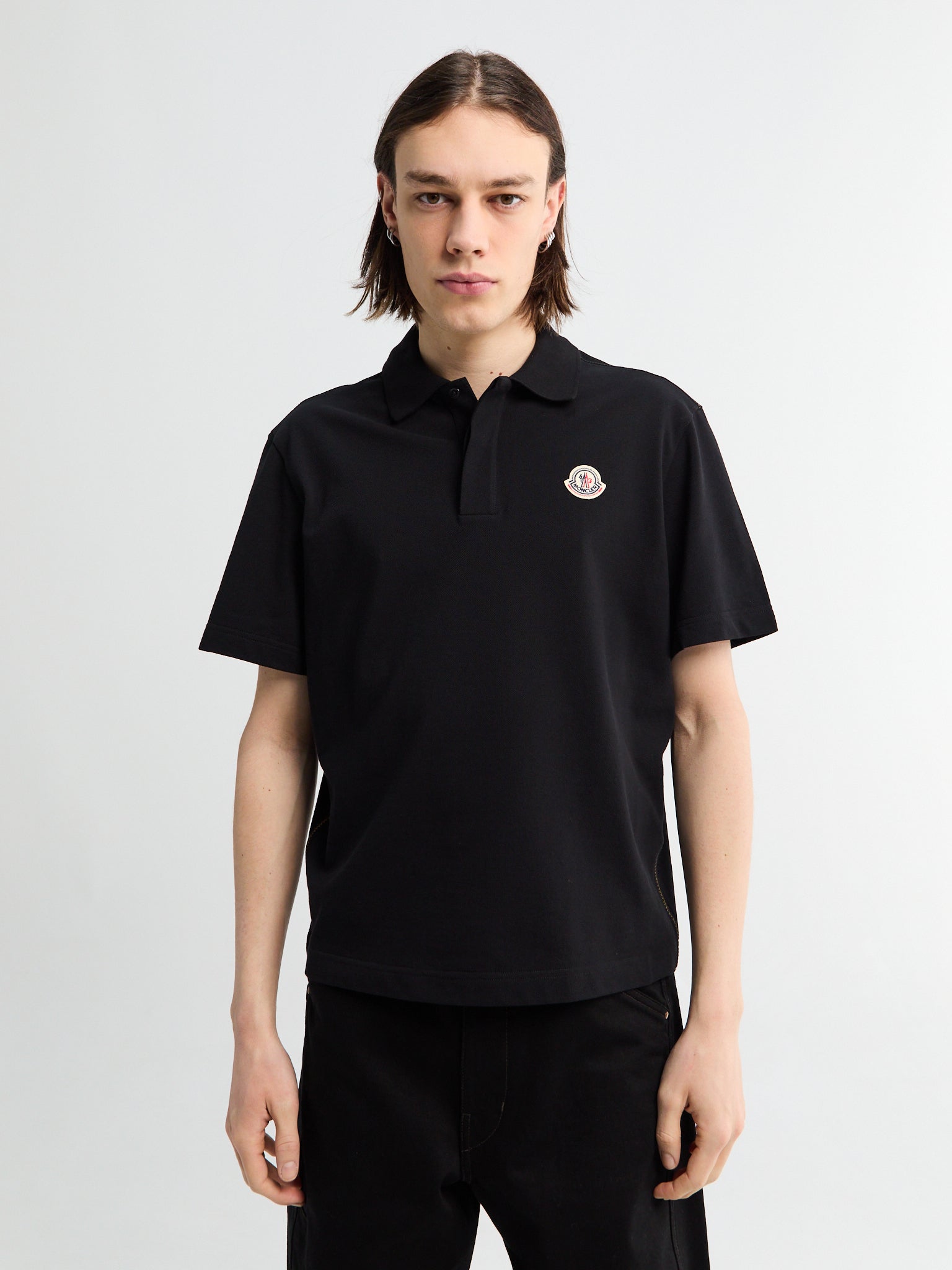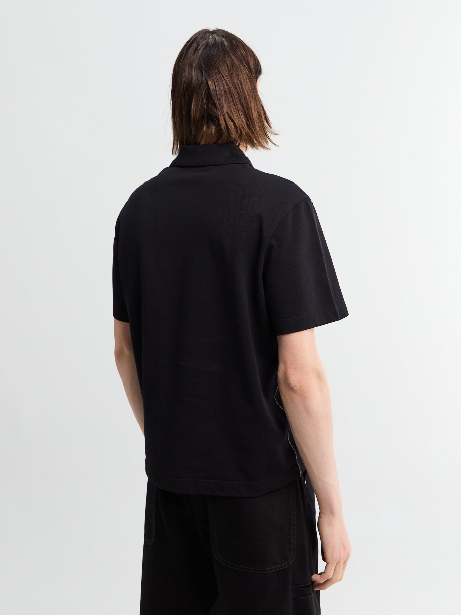 Classic black polo shirt made from cotton piquet fabric. Features a snap button collar, short sleeves, and branded logo patch.
