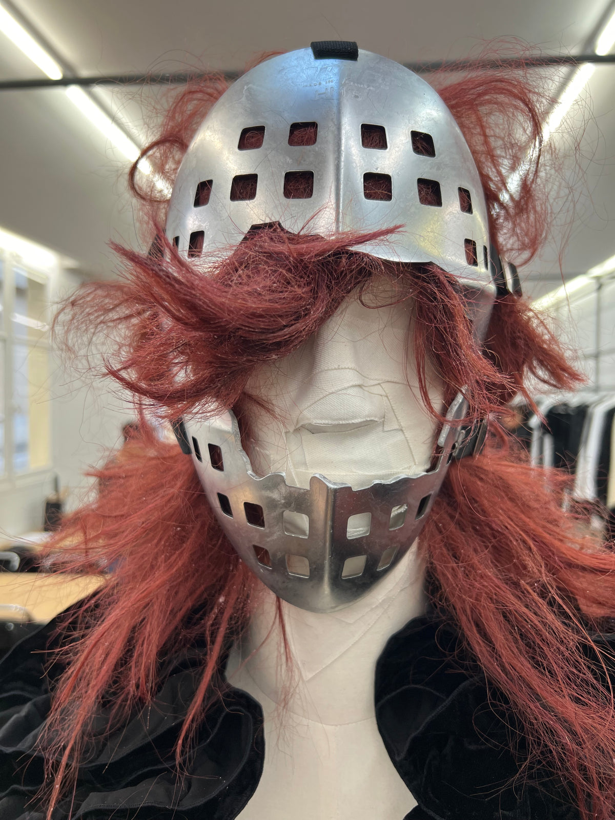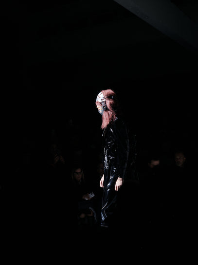 Sculptural tailoring, exaggerated silhouettes and volume, exposed constructions, jumpsuits, shorts, trousers, laced shirting. Classic Homme Plus codes were all there, but pushed to extremes. Most noticeably were the masks and the wigs — Hannibal Lecter– and Jason Voorhees–esque hockey masks.