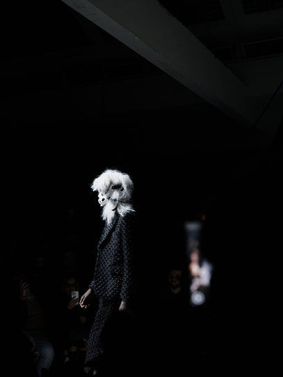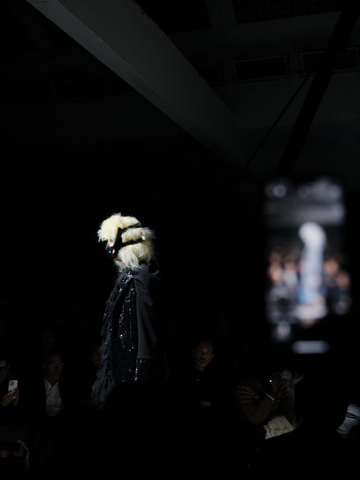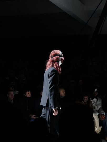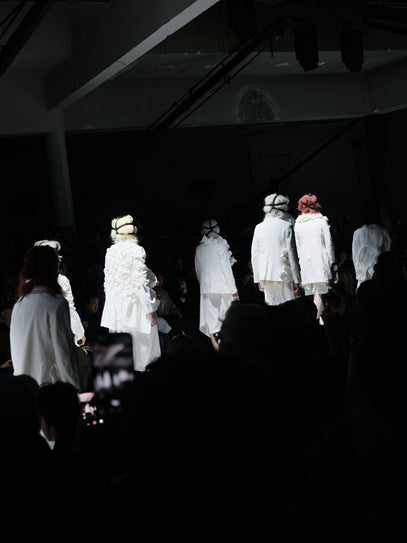 Jackets with missing backs, some missing fronts, distorted proportions, ruffles, and layered textures. Towards the end, something shifted. White looks appeared. Soft, hopeful, and very moving. A contrast to everything that came before. Light after darkness? Or at least, the possibility of it. I don’t know how she pulls it off, but year after year, at this specific show, it feels original. Rei is a true testament to pushing forward and breaking rules.