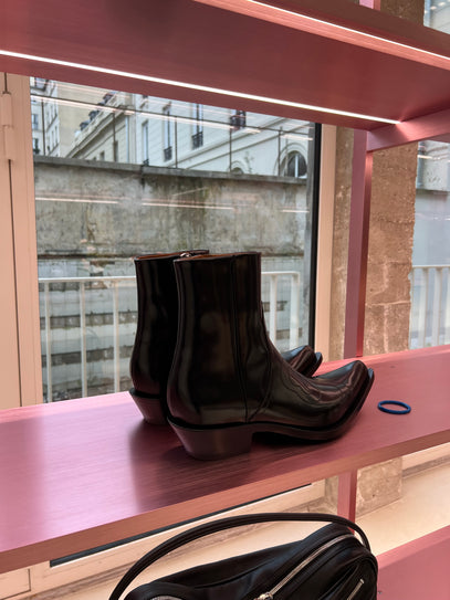 Meta Campania Collective’s newest collection was presented in their showroom / office / store located in the 6th Arrondissement. Another highlight — not only because of the clothes, but because of the people behind the brand. Founder, Creative Director, and CEO Jon told us that this season he drew a lot of inspiration from the Grisons region in Switzerland — a place he frequently visits, and one that’s close to his heart due to family holidays and his family’s origins. Another source of inspiration is Meta Campania Collective’s ongoing collaborative series, Lives and Works In, this year continuing their collaboration with Italian artist Giovanni Leonardo Bassan, who also designed interior pieces for the occasion. They also collaborated with Iranian artist Bibi Setareh Manavi — both artists were featured in the seasonal lookbook.