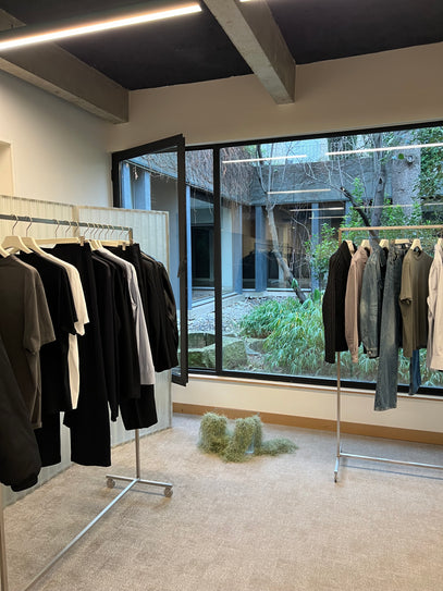 Great, simple, and beautifully made clothes. It all feels very homemade and lived-in, in the best way imaginable. Timeless, considered, and extremely tasteful! A couple more cool details: their lights were all made from leftover fabric. Whenever you produce clothes, there’s obviously going to be leftover fabric — but instead of wasting it, they used it to create these soft, sculptural lamps throughout the showroom. A small detail, but one that perfectly reflects their mindset.