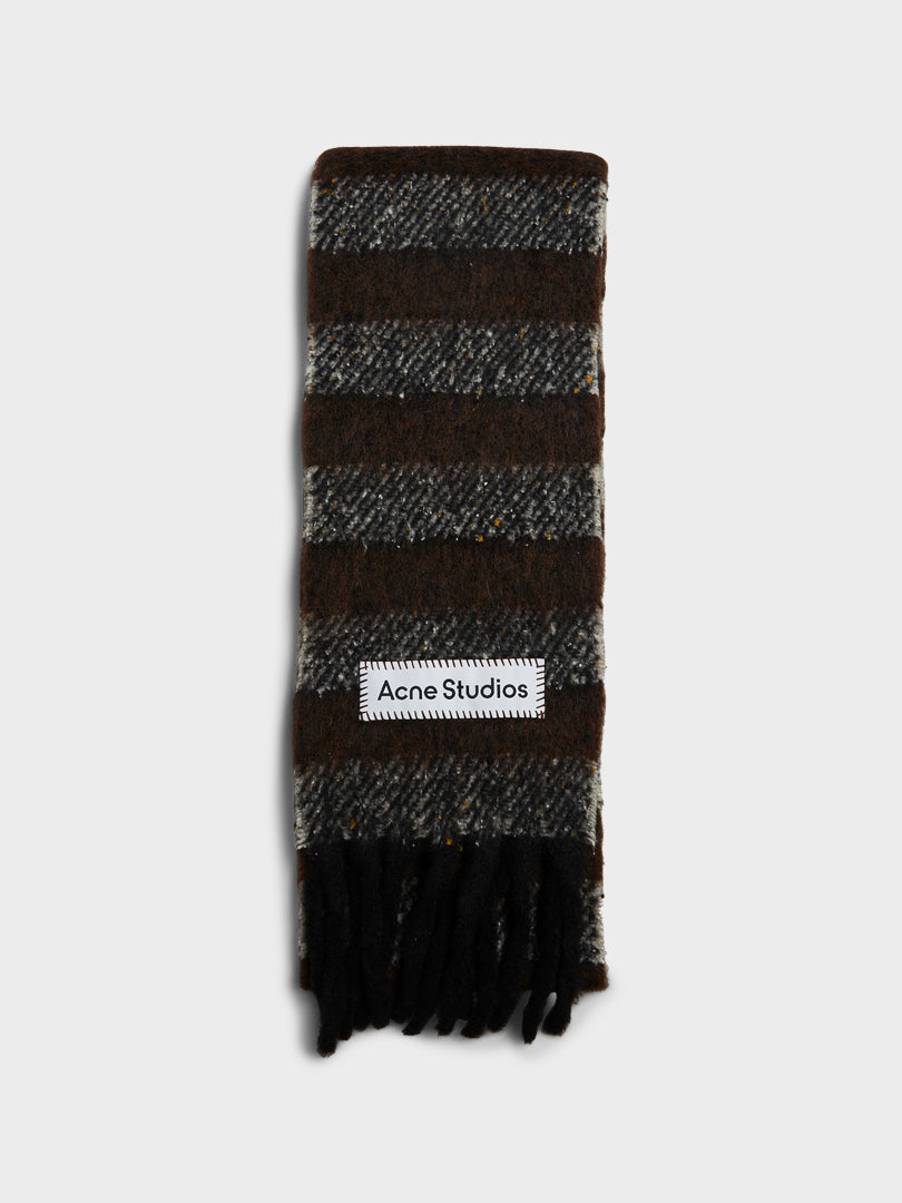 This scarf showcases a striped design and is made from a blend of alpaca and wool. It includes a discreetly embroidered logo label for understated branding. The scarf is finished with fringed edges.