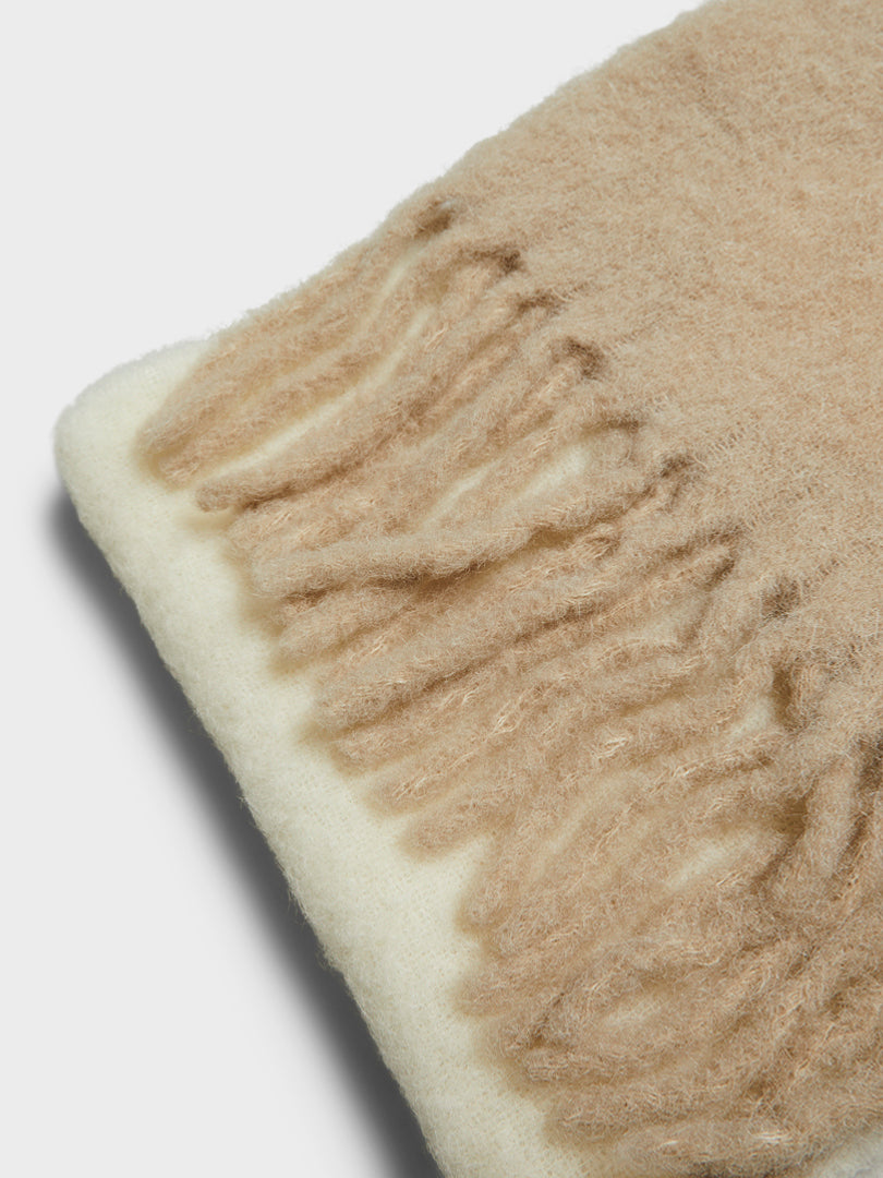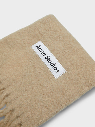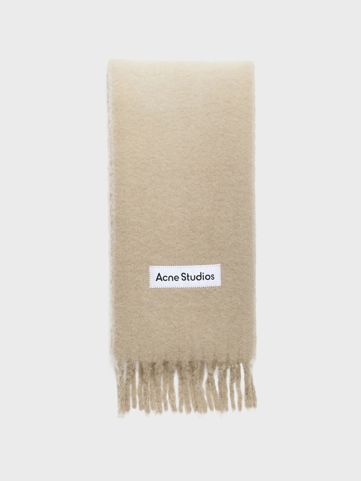 This scarf is made of soft wool-mohair and showcases fringes at the ends. It is completed with an Acne Studios logo label detailed with blanket stitching and crafted in Italy.