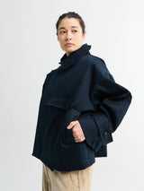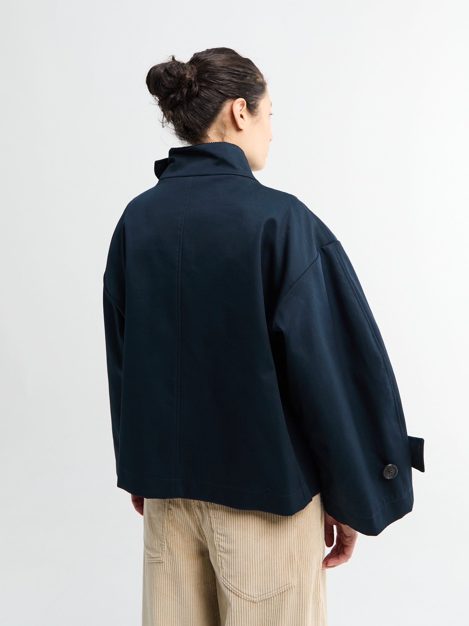 Water Resistant Jacket in Navy from Af Agger now with embroidered logo on the sleeve. The coat has light horn buttons, matching corduroy inner collar, and adjustable wrist straps.