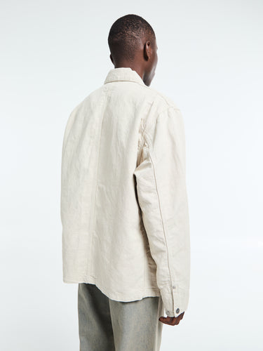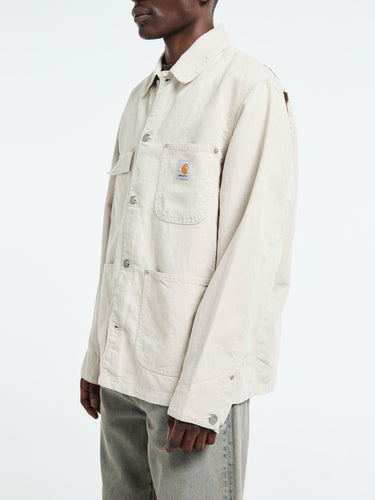 The Walter Chore Coat is a work inspired jacket made from cotton linen canvas. It is garment dyed for a softer feel and unique color. The jacket features four front pockets and button closure. A woven square logo label completes the design.