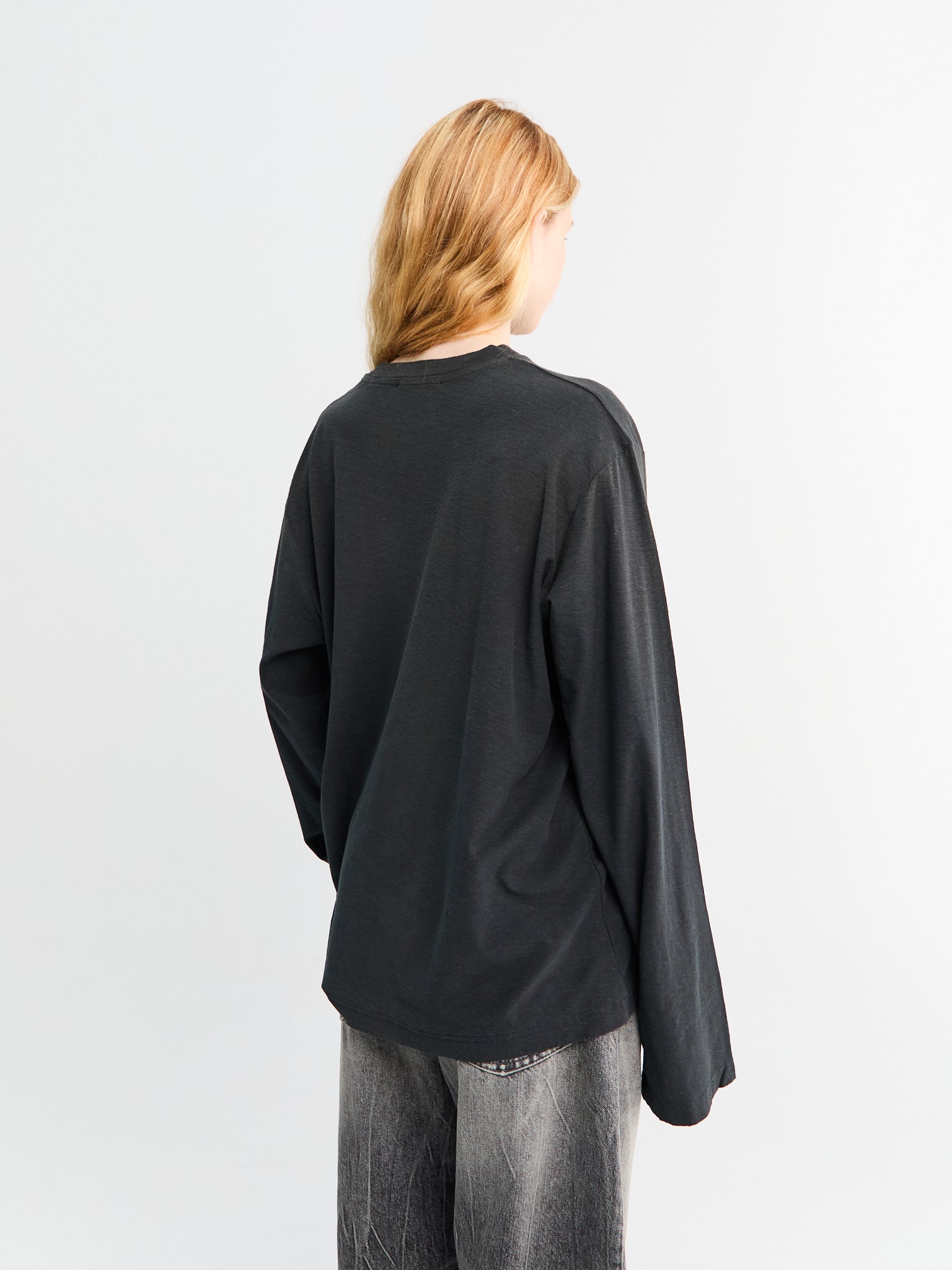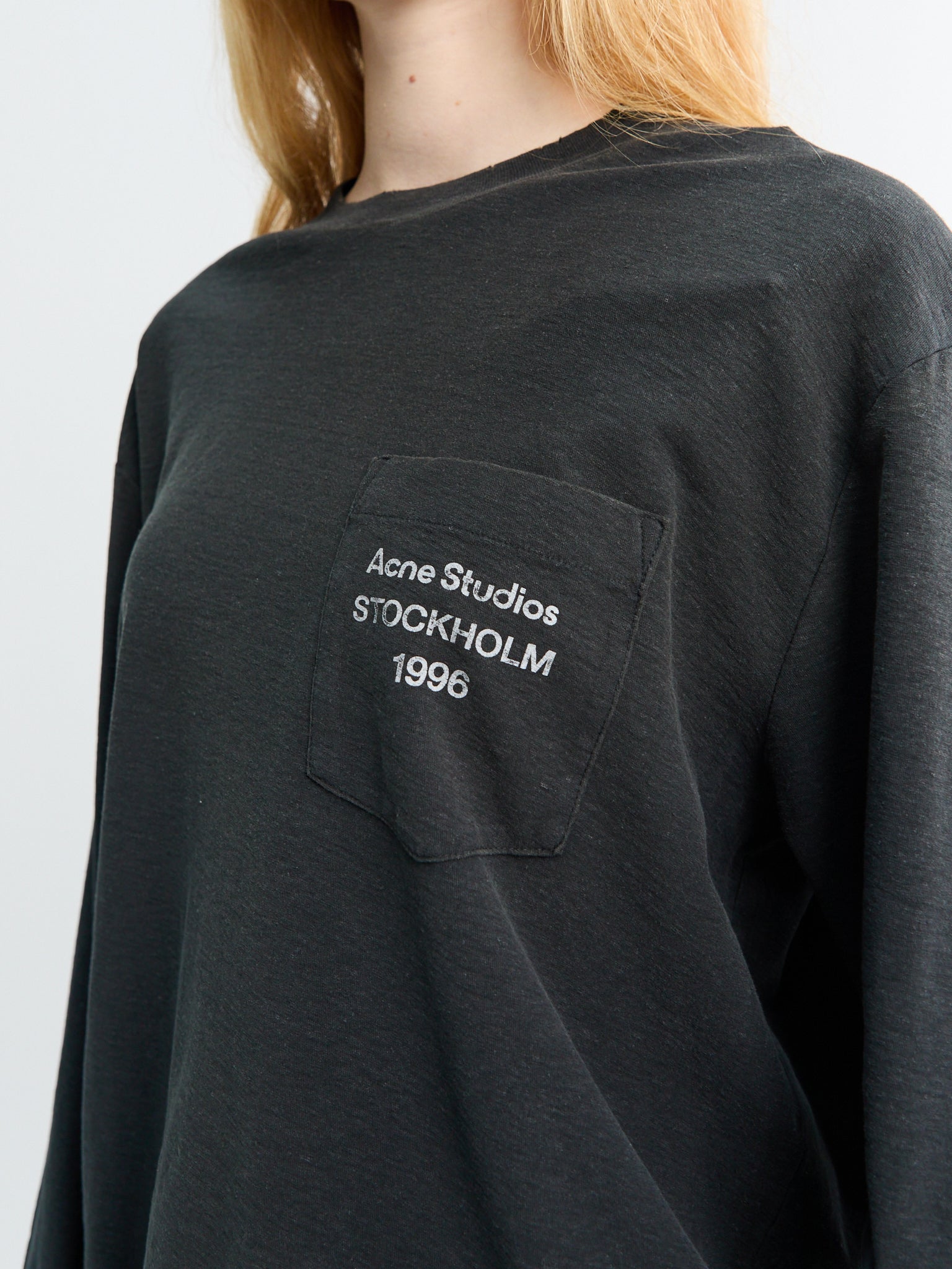 This long-sleeved crewneck t-shirt is made from soft jersey fabric and offers a vintage-inspired style. It includes a chest pocket adorned with a logo and a ribbed neckline, designed for a comfortable, relaxed fit.