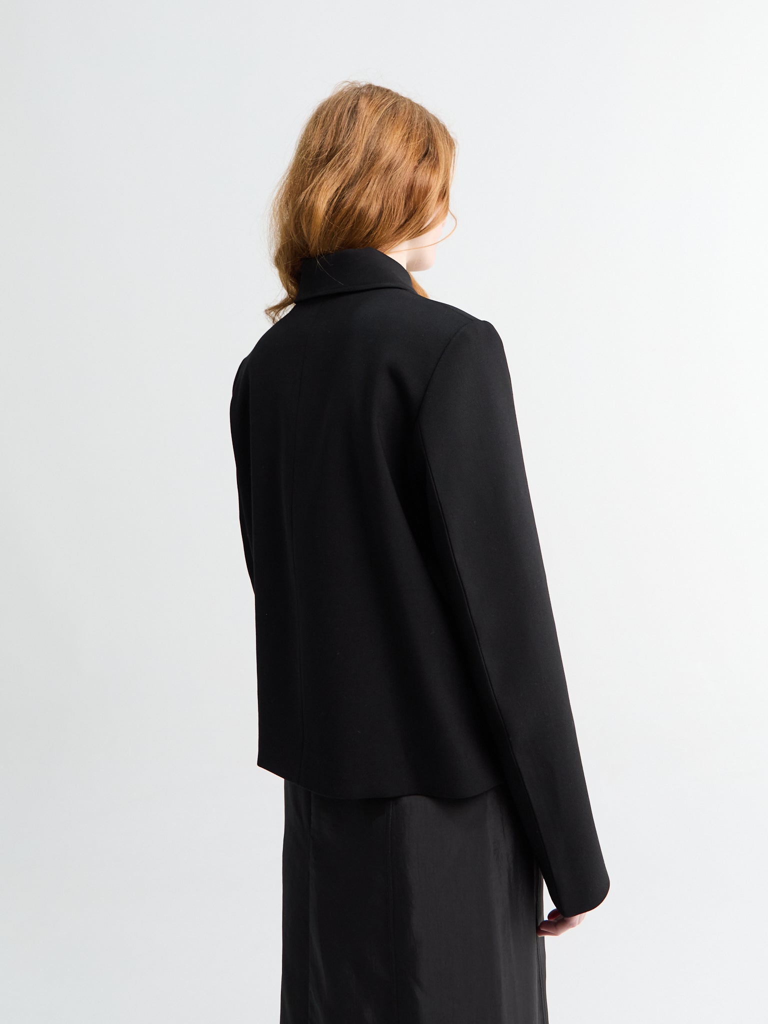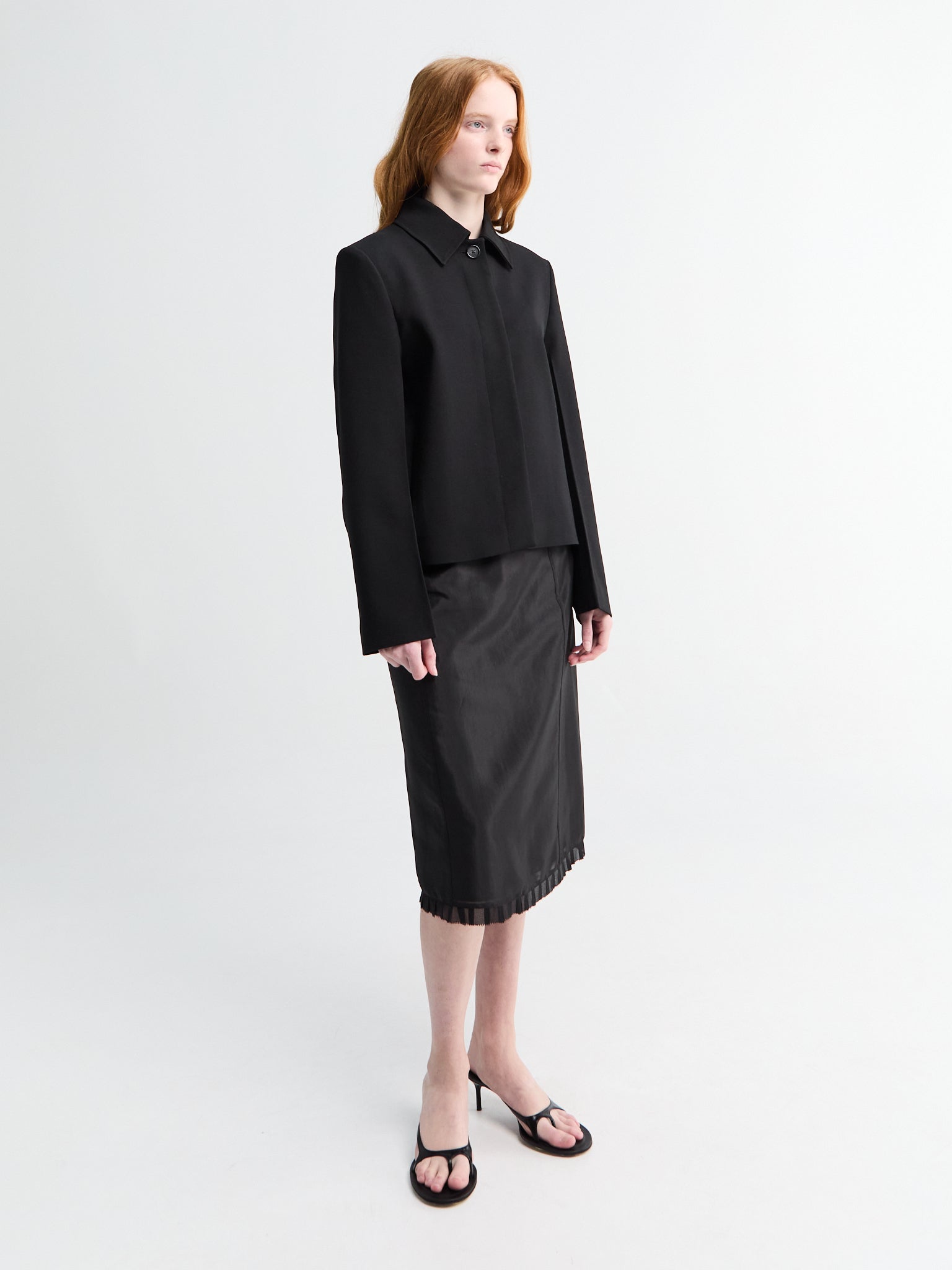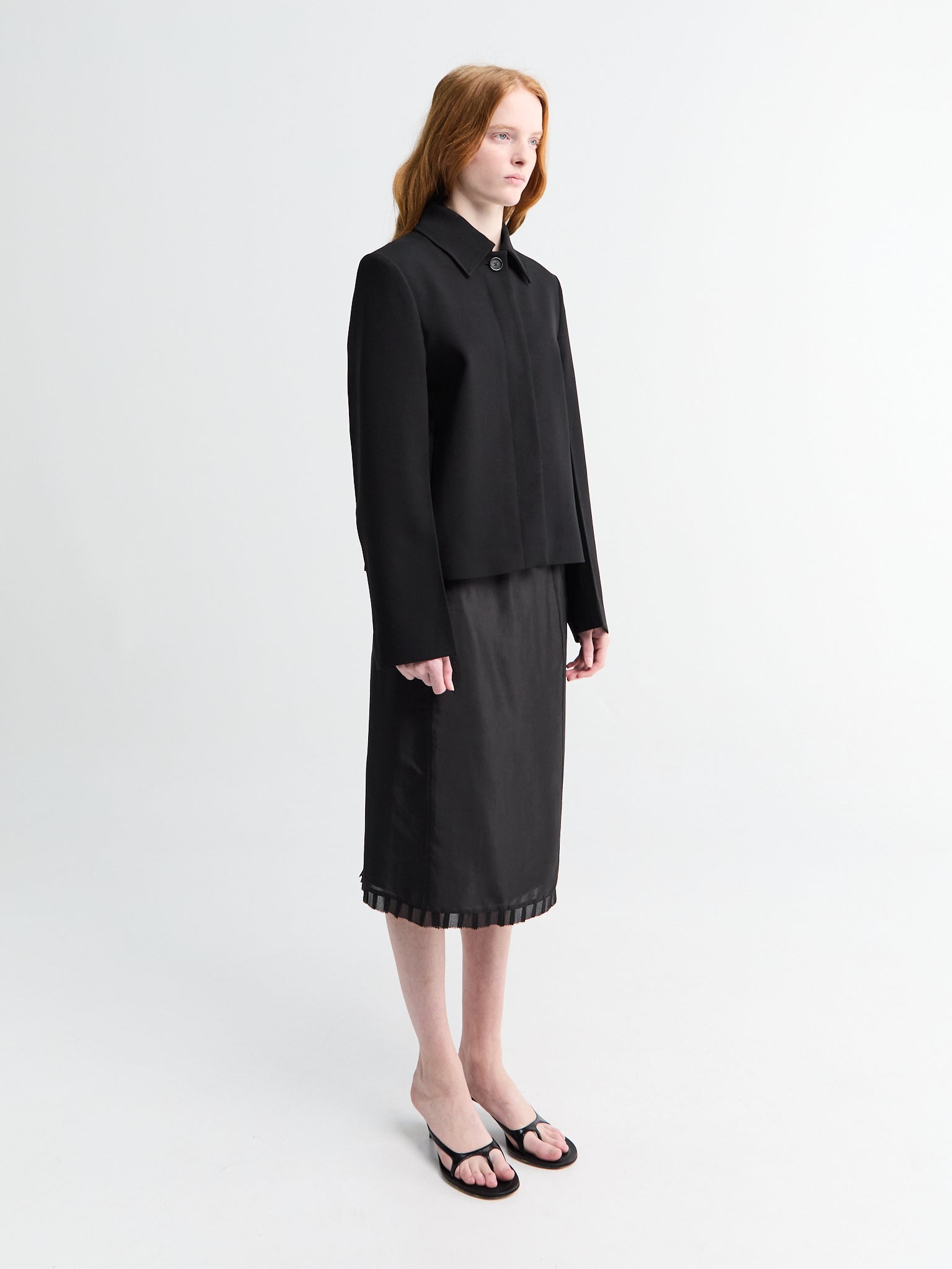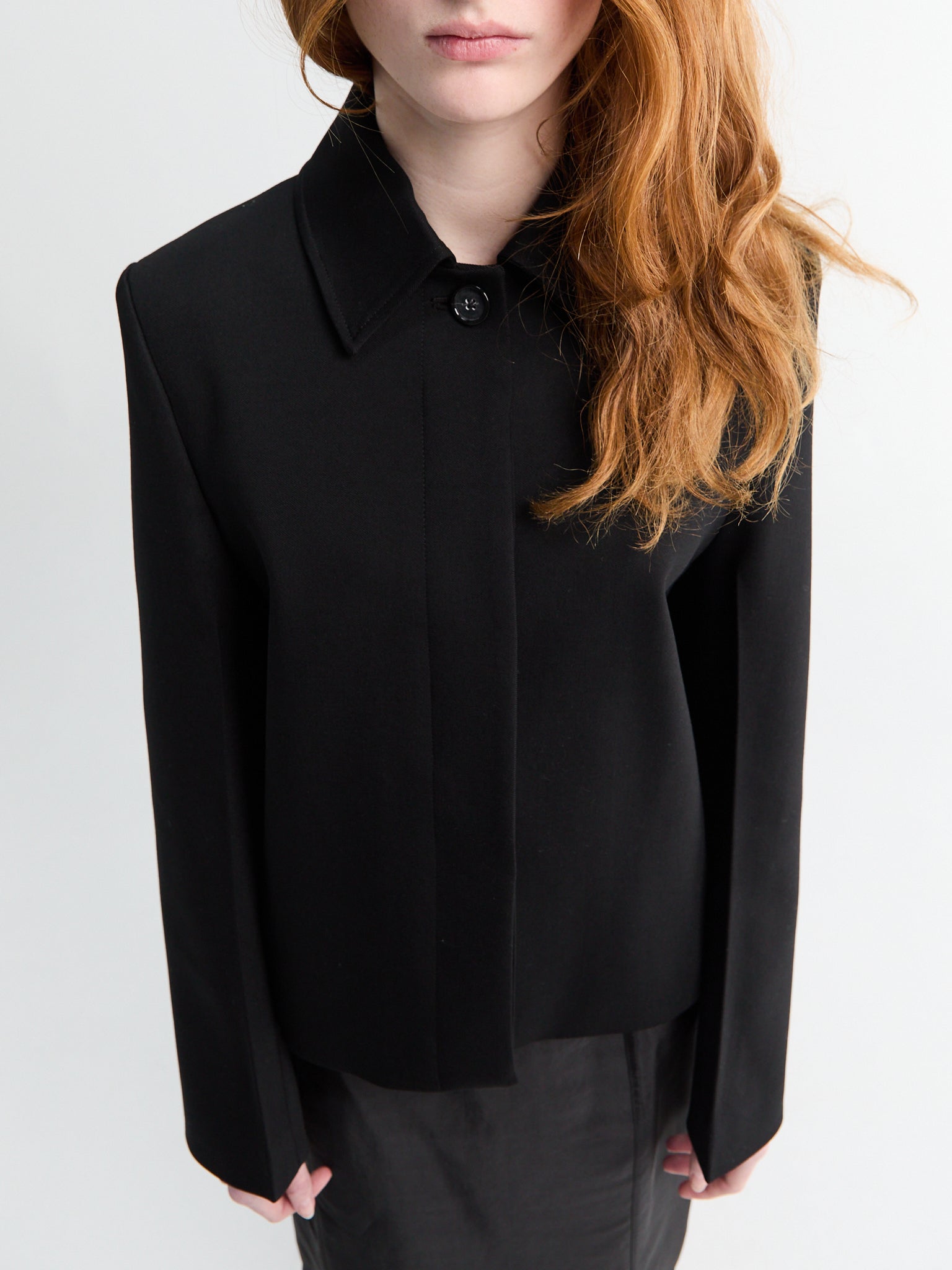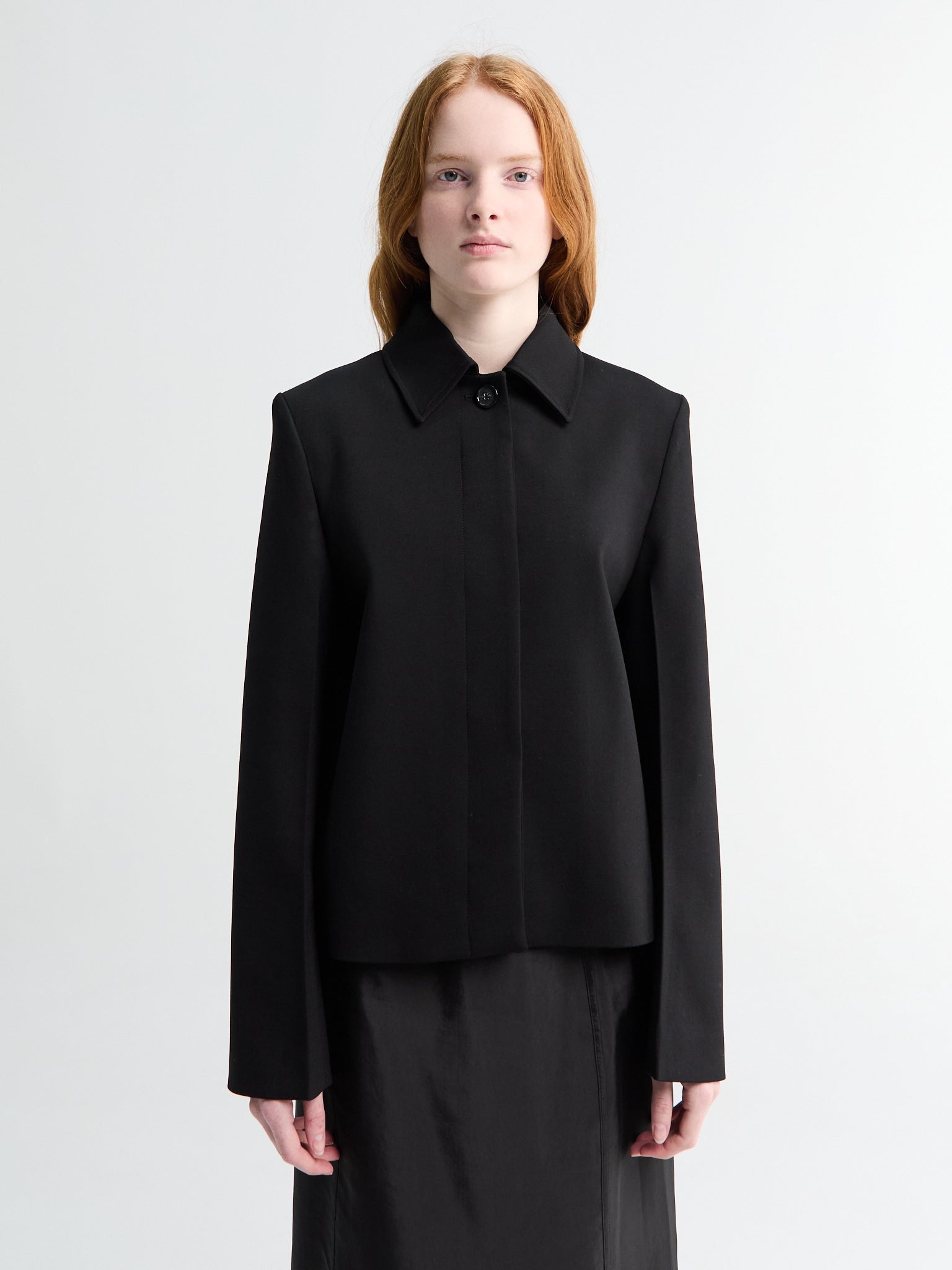 This boxy jacket is shaped from structured twill and cut for a straight, relaxed silhouette. It features a sharp collar and discreet front pockets, with a concealed button closure preserving the clean lines.