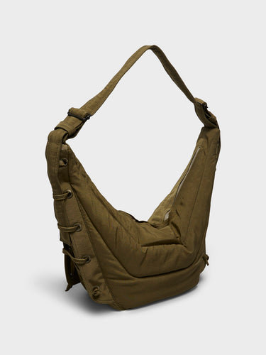 Medium shoulder bag in khaki nylon canvas with a padded, water-repellent finish. Features an adjustable strap, an inner zip pocket, and side laces to adjust the volume. Can be worn over the shoulder or crossbody.