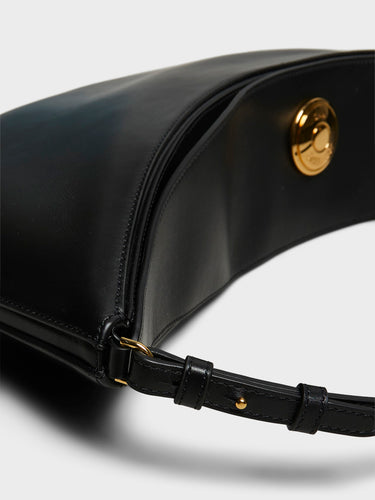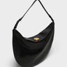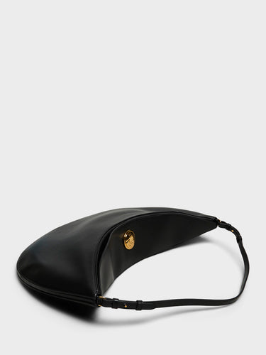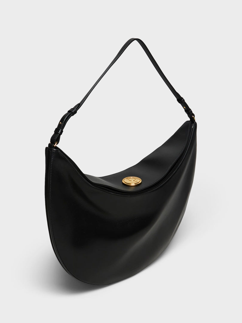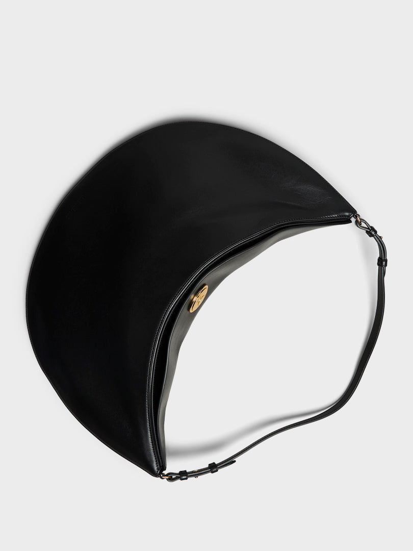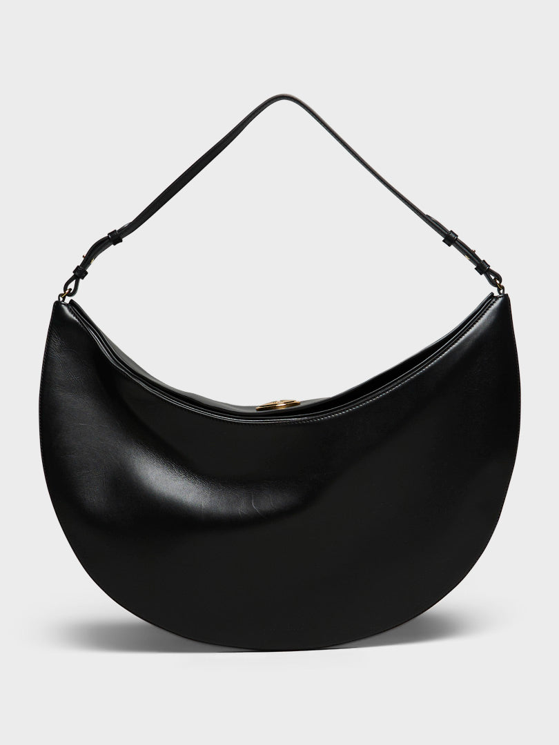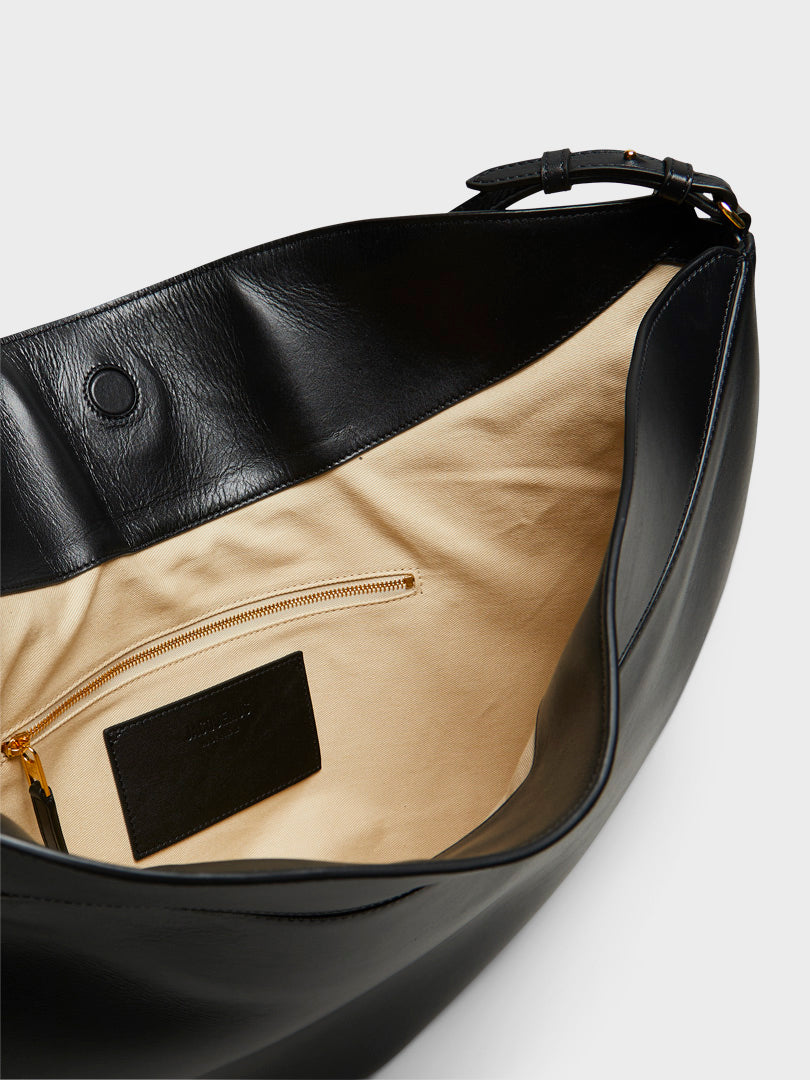 This large hobo bag is made from smooth leather in black. It has a slim shoulder strap, a magnetic flap closure, and an interior zipped leather pocket for secure storage.