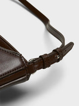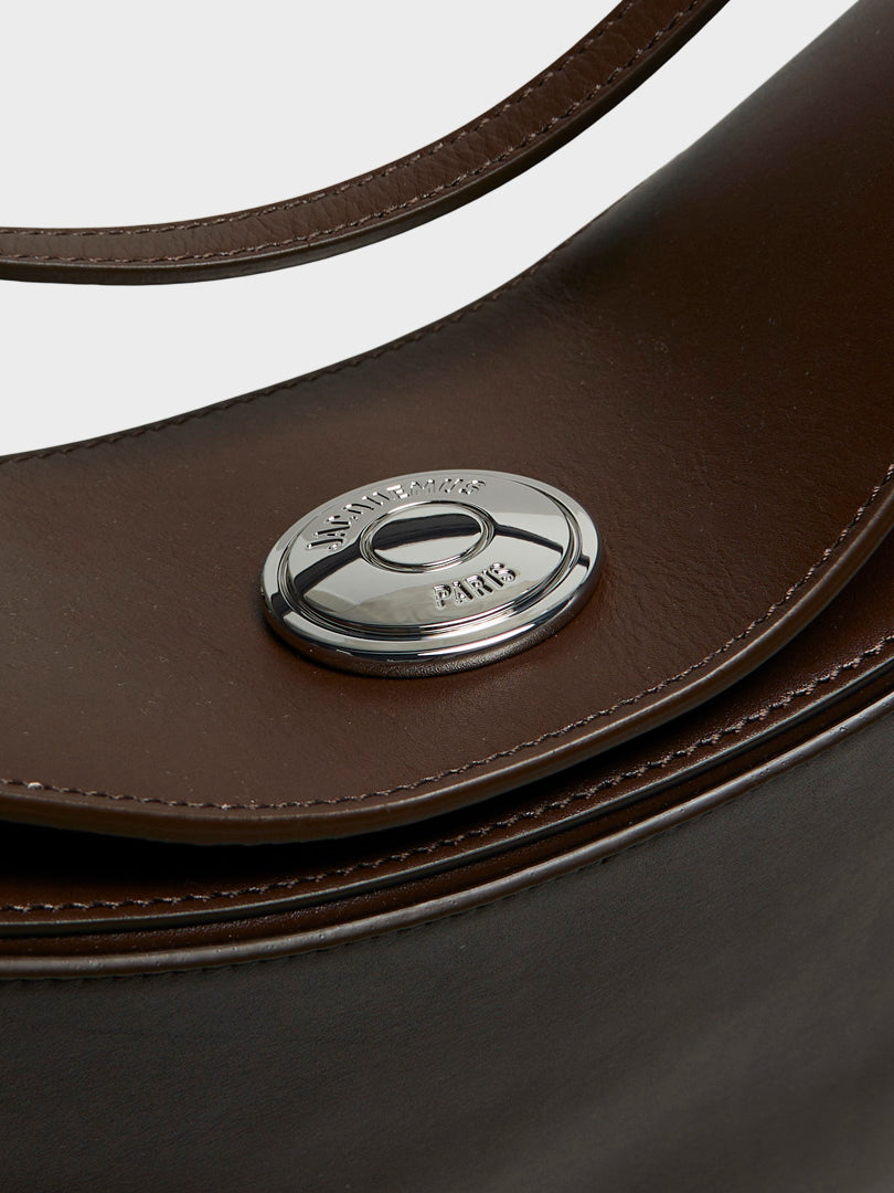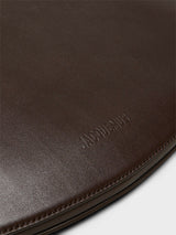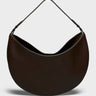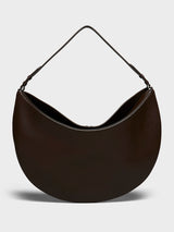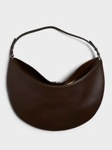 This large hobo bag is made from smooth leather in a deep brown color. It has a slim shoulder strap, a magnetic flap closure, and an interior zipped leather pocket for secure storage.