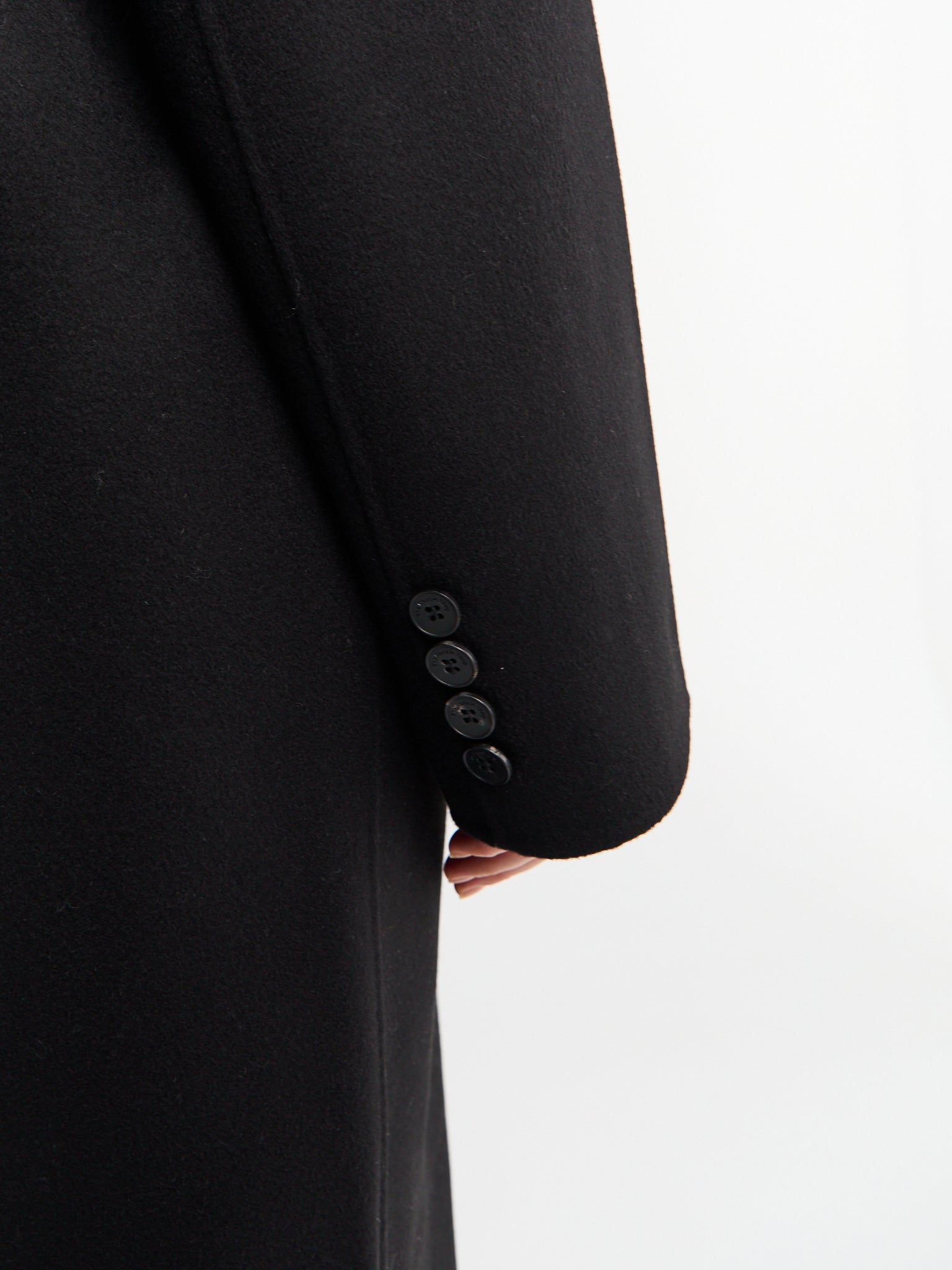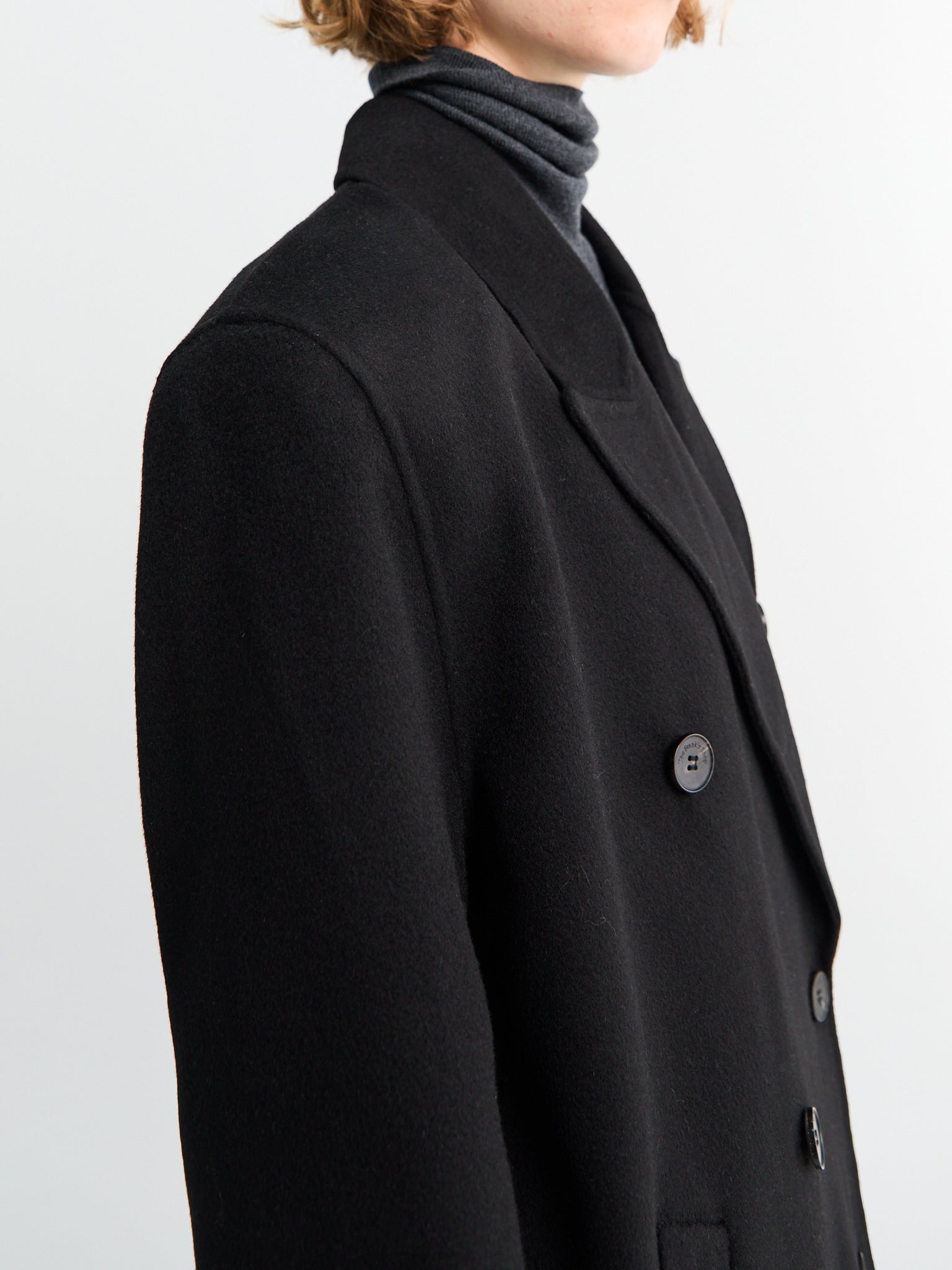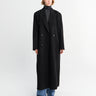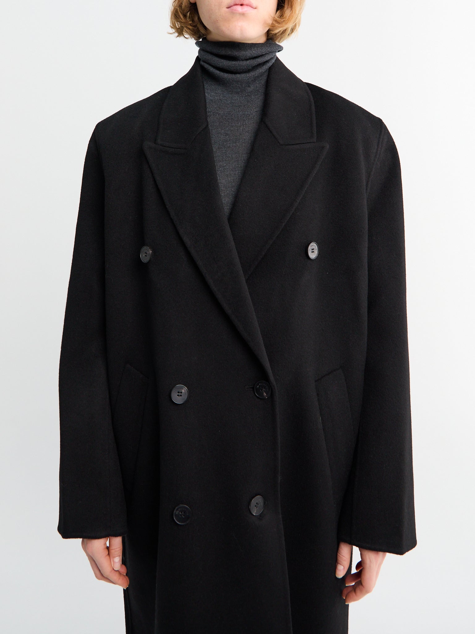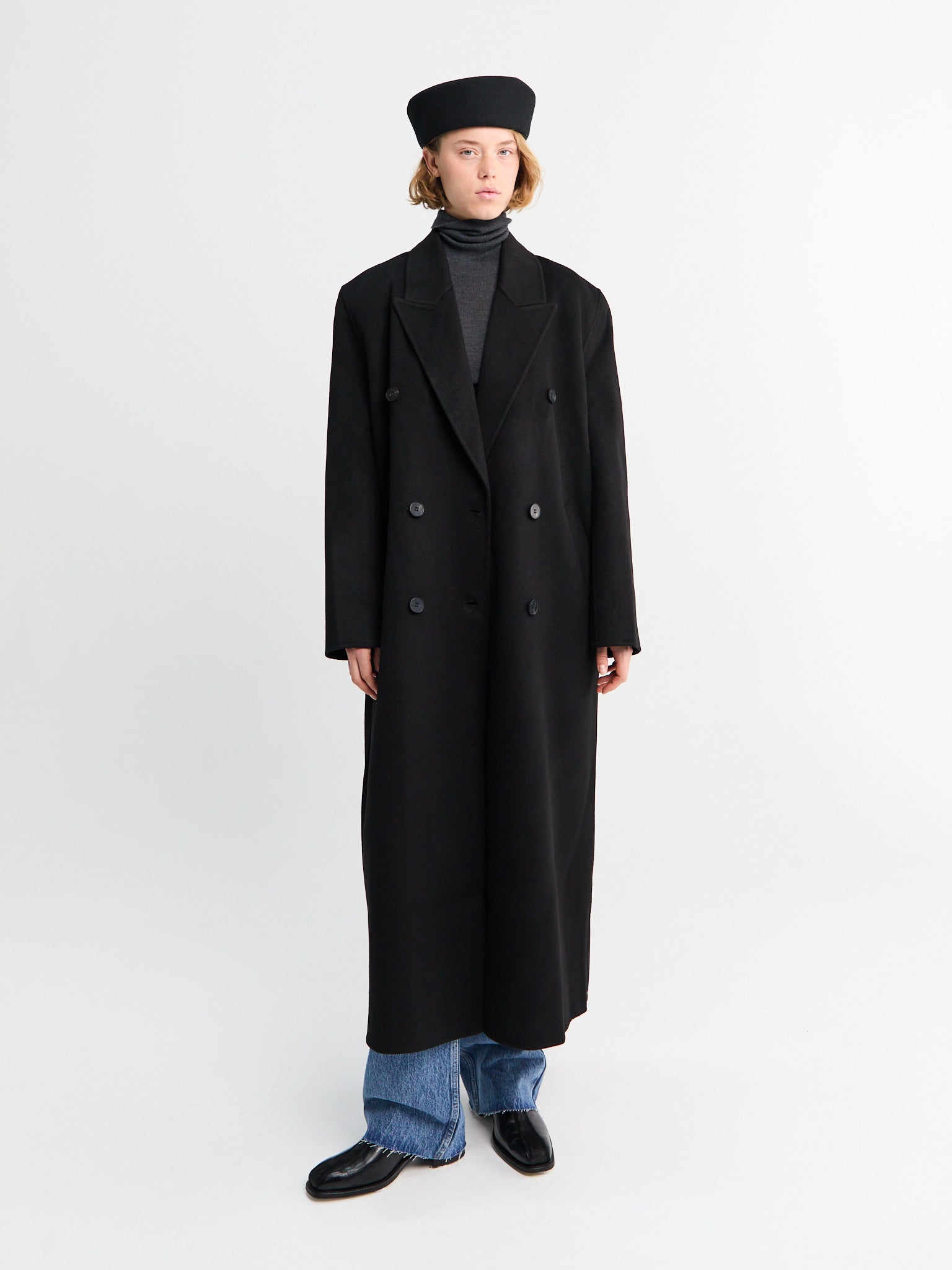 Crafted from a midweight wool blend, this coat features an oversized fit and maxi length. It includes peak lapels, drop shoulders, and welt pockets for practicality. Designed with a double-breasted button front, fully lined for added comfort.