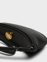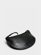 Small folded shoulder bag crafted from smooth leather, the leather is unique for each piece. It can be worn with a wrist or shoulder strap, equipped with a slim, detachable shoulder strap. Secured by a magnetic flap with a prominent, engraved snap closure.