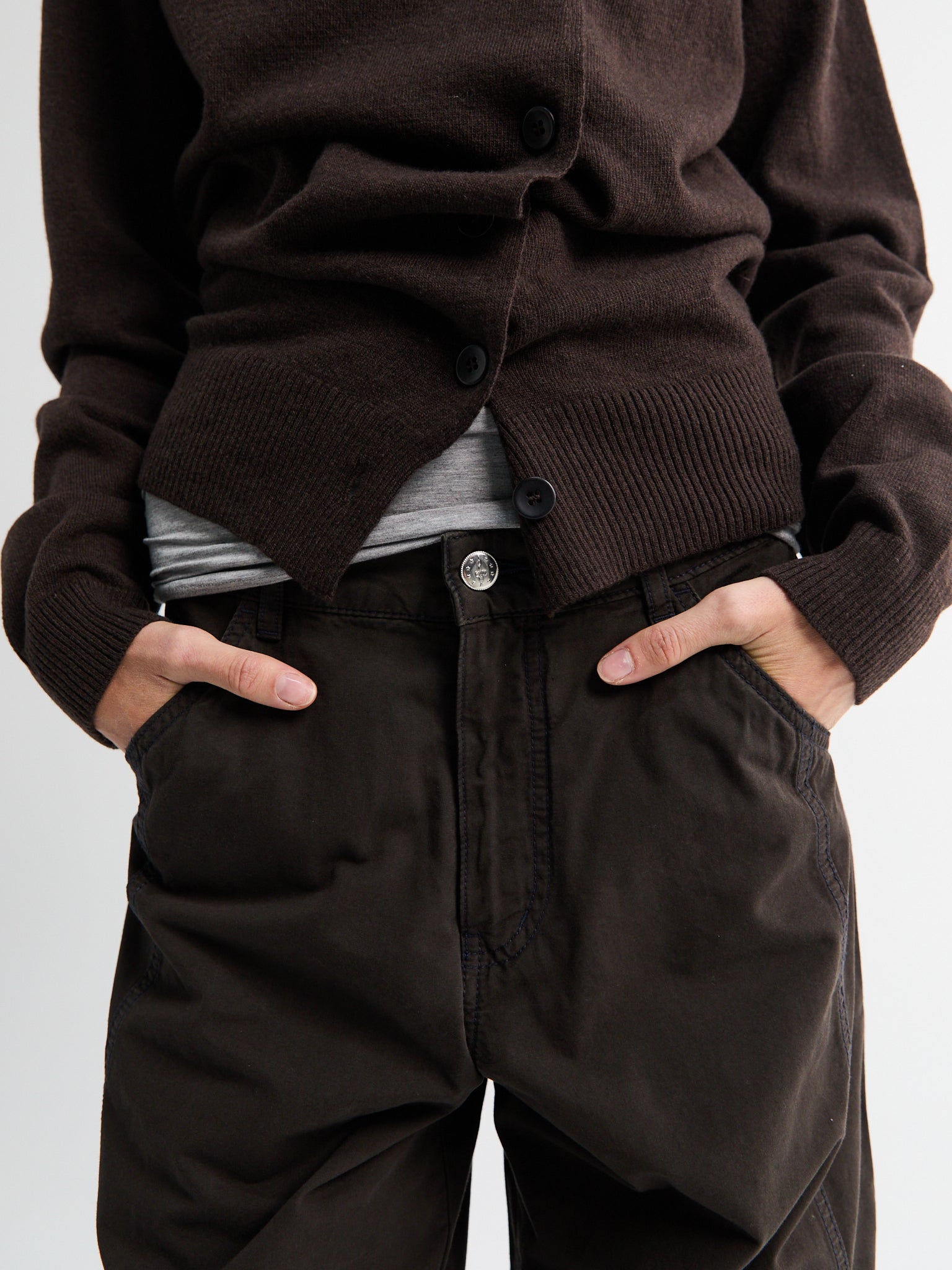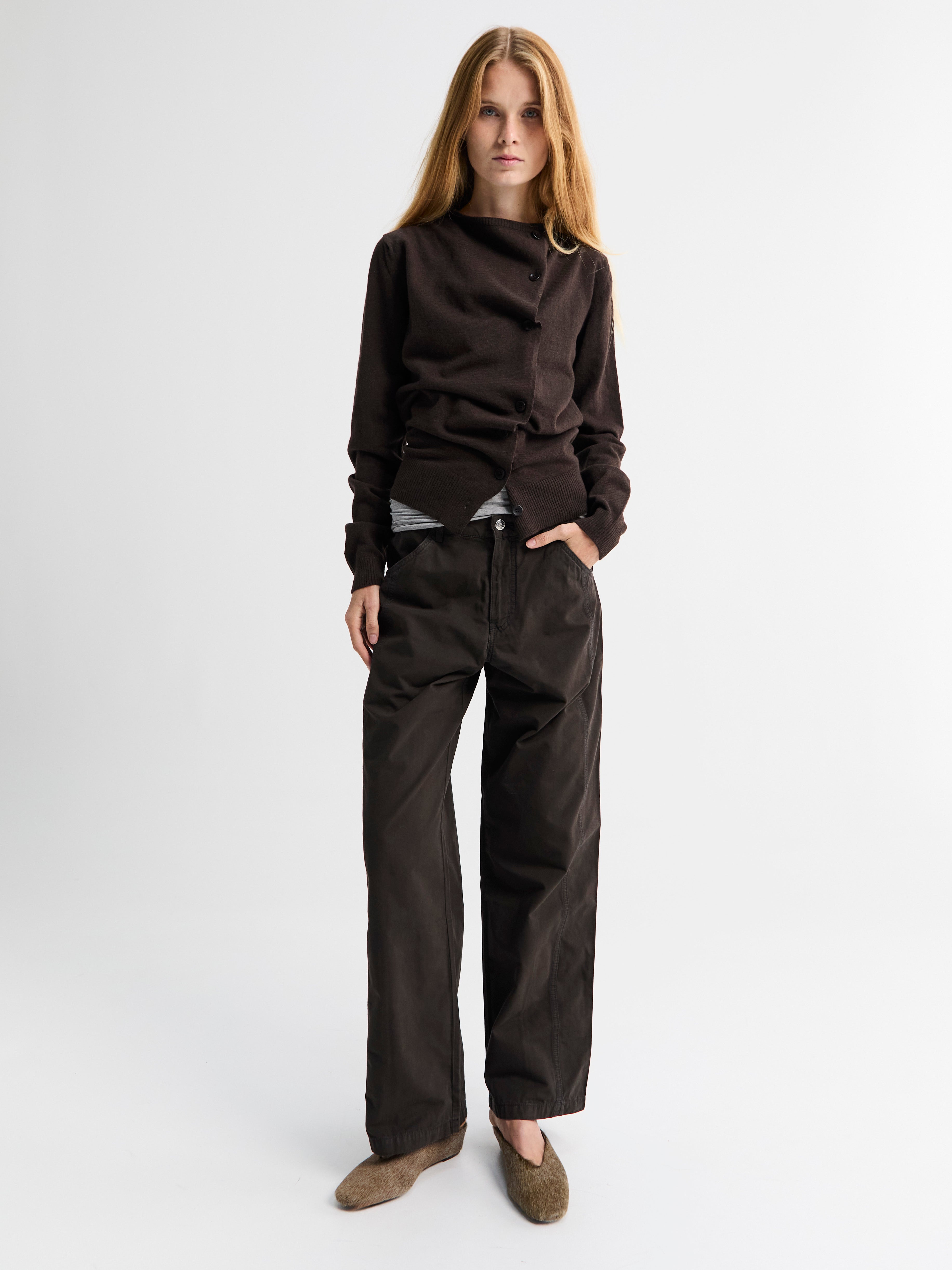 The Reyn Pants in brown from Paloma Wool are made from lightweight cotton canvas. They feature belt loops, slanted side pockets, and two back pockets. The pants have visible dark stitching and a silver logo button at the waist. With wide, straight legs, they offer a simple and timeless style