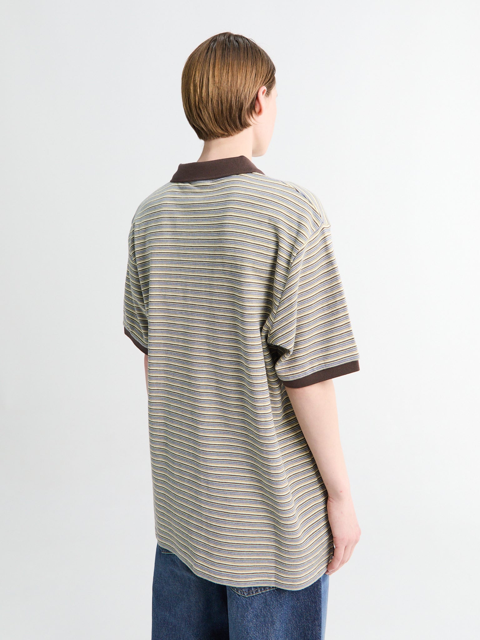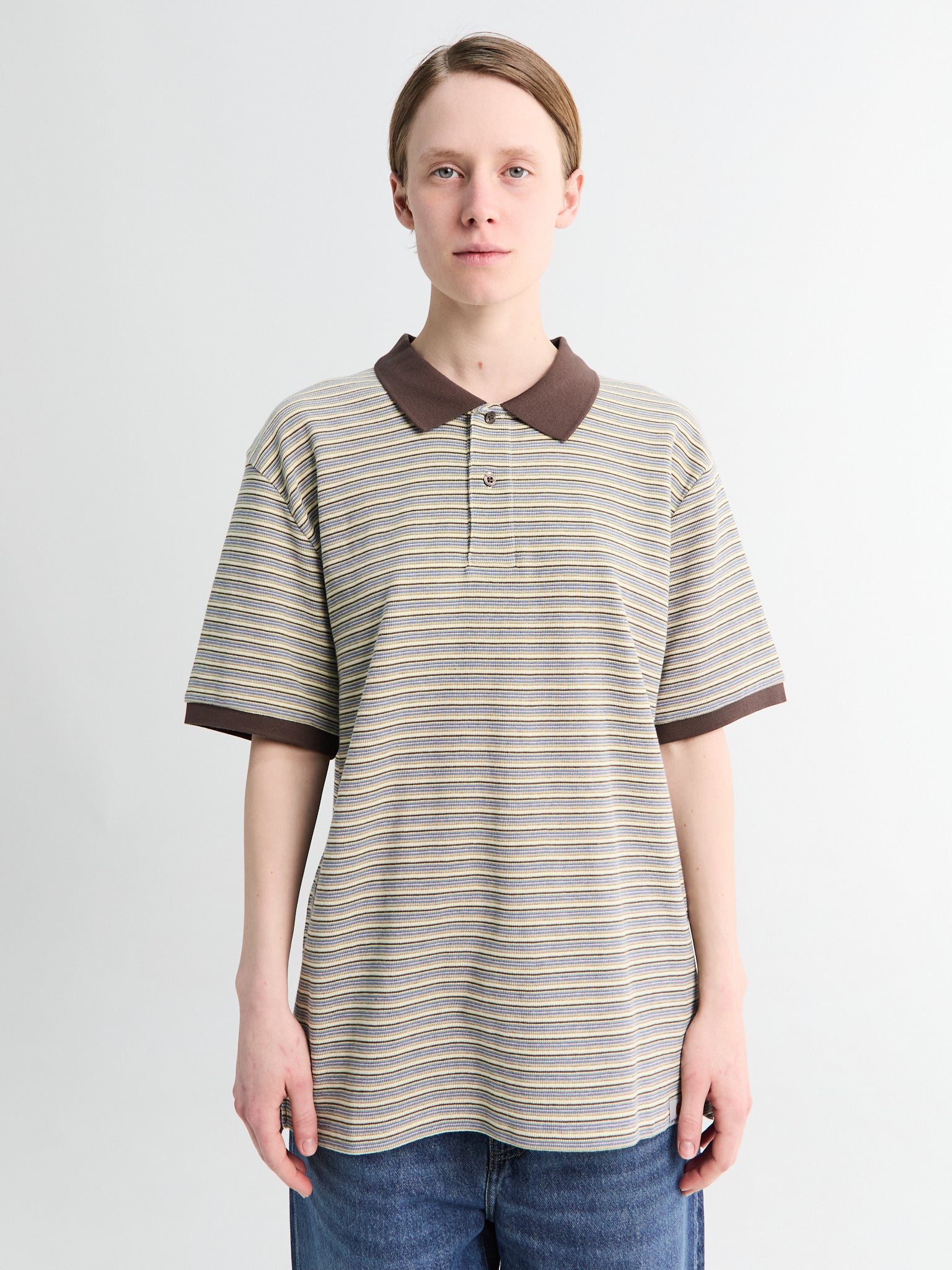 The Dion Polo is constructed from a midweight cotton jersey, featuring an allover yarn-dyed stripe pattern. It is detailed with a two-button placket.