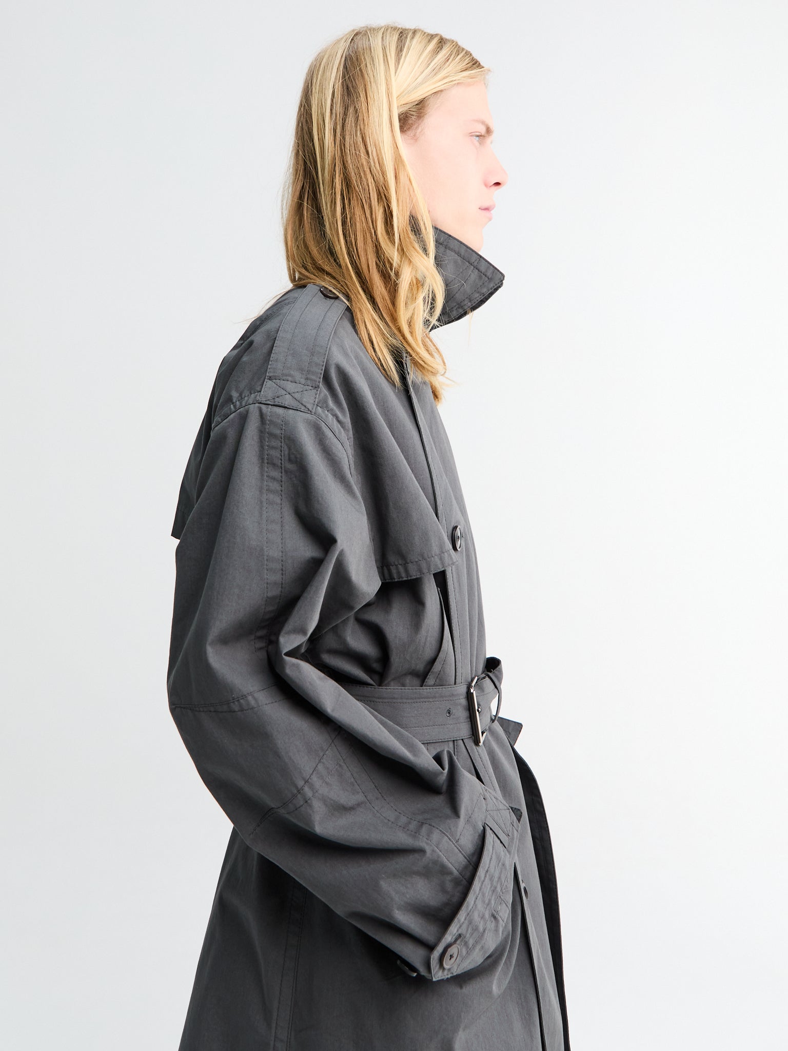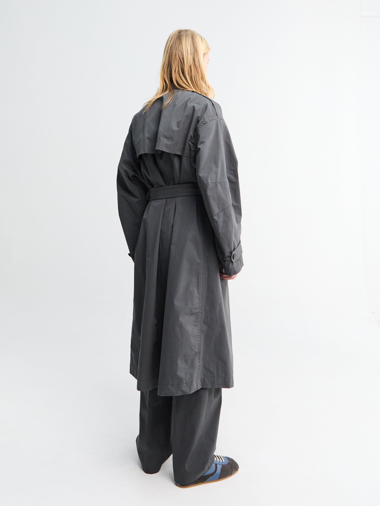A timeless dark grey wool blend coat with clean lines and elegant proportions. Features a single-breasted button front, traditional notched lapels, and a back vent for comfortable wear.