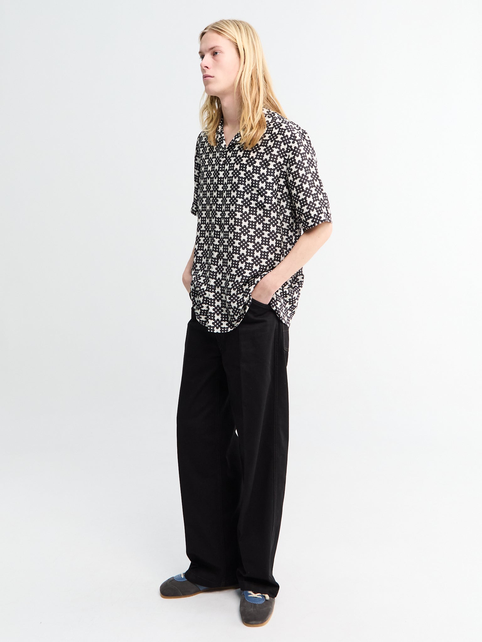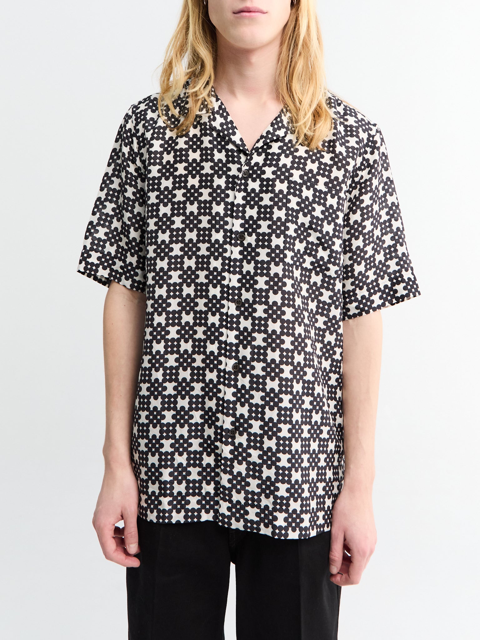 A classic short-sleeve silhouette, defined by an intricate, all-over geometric motif across a black base.