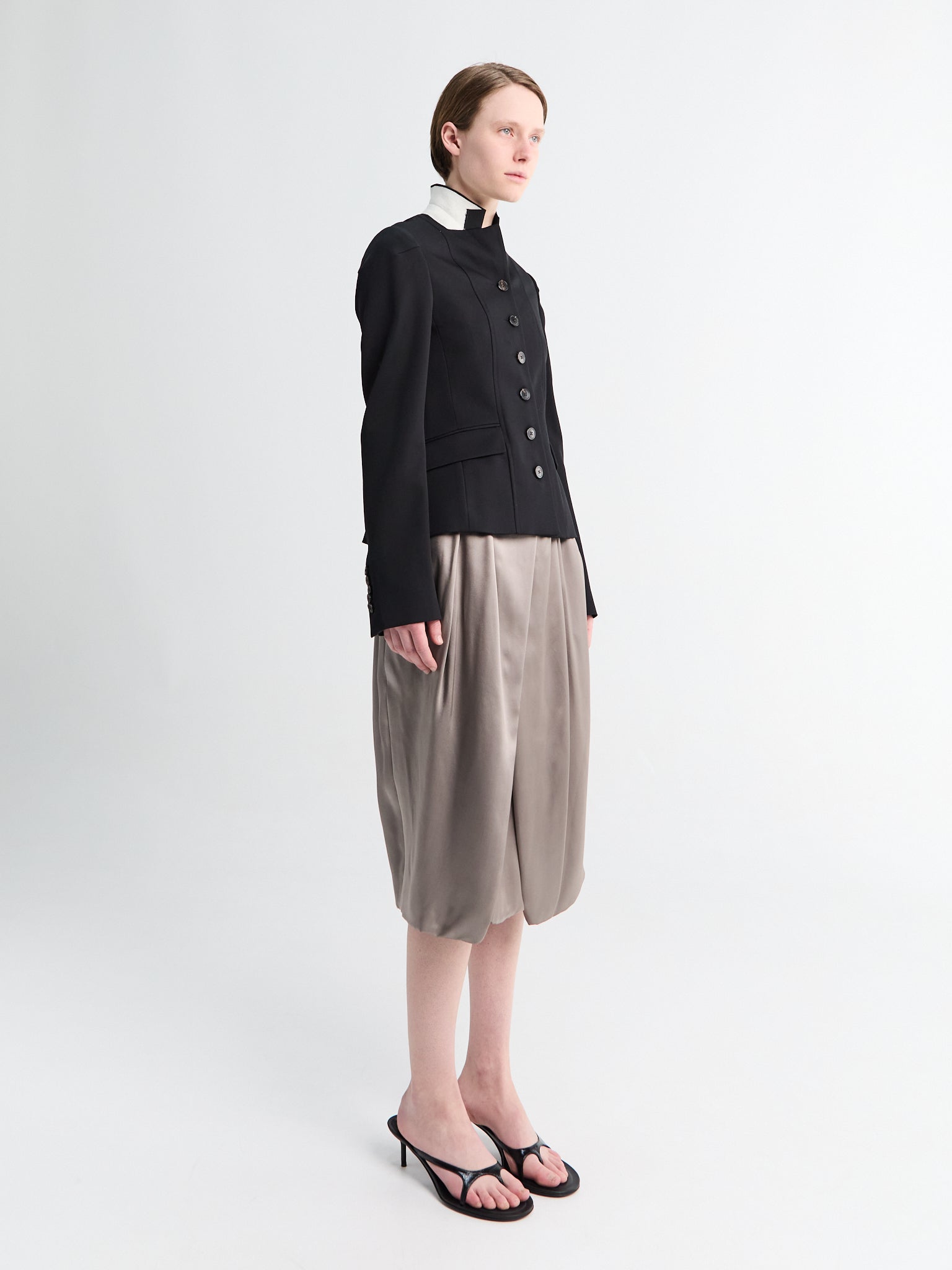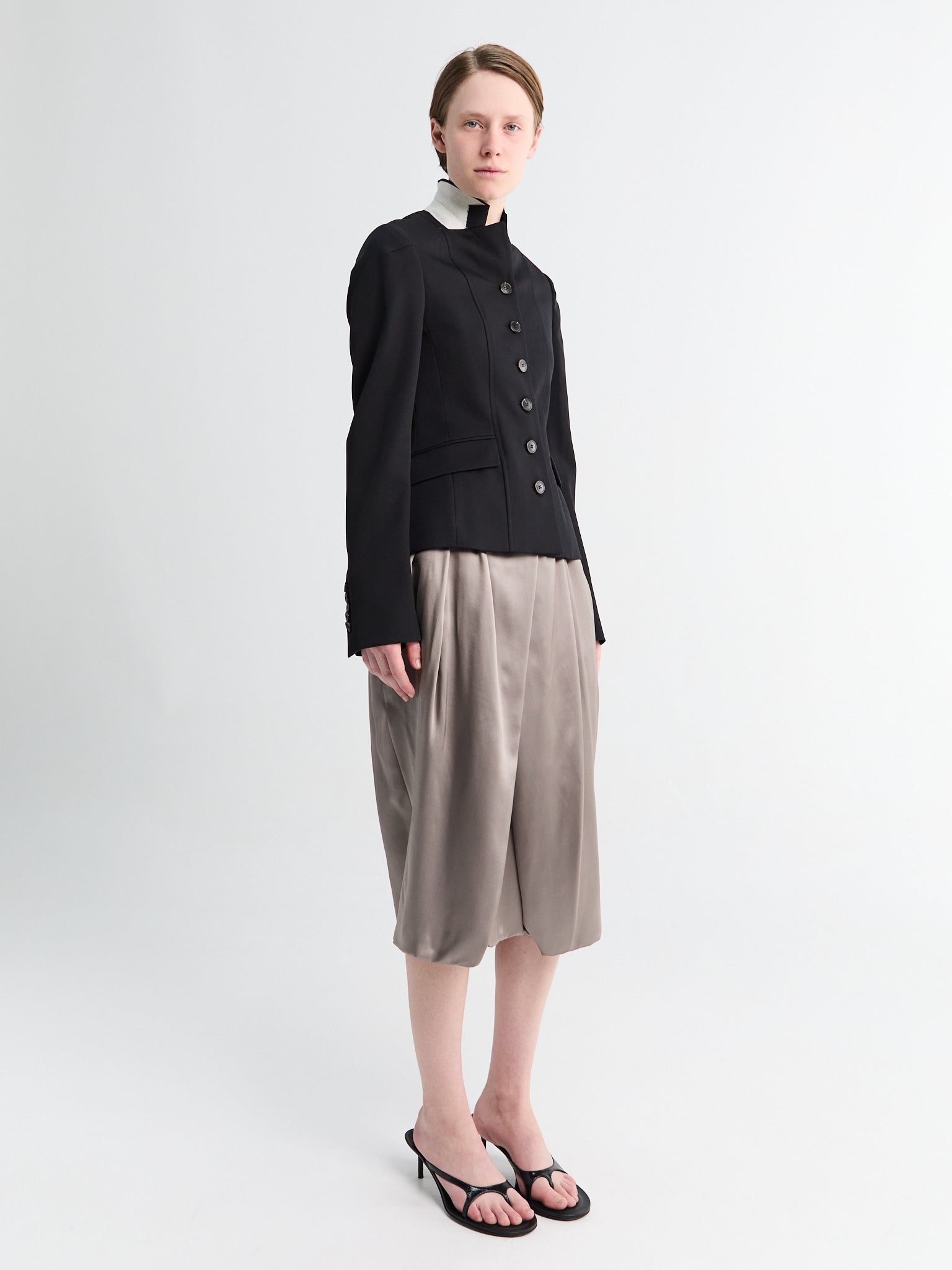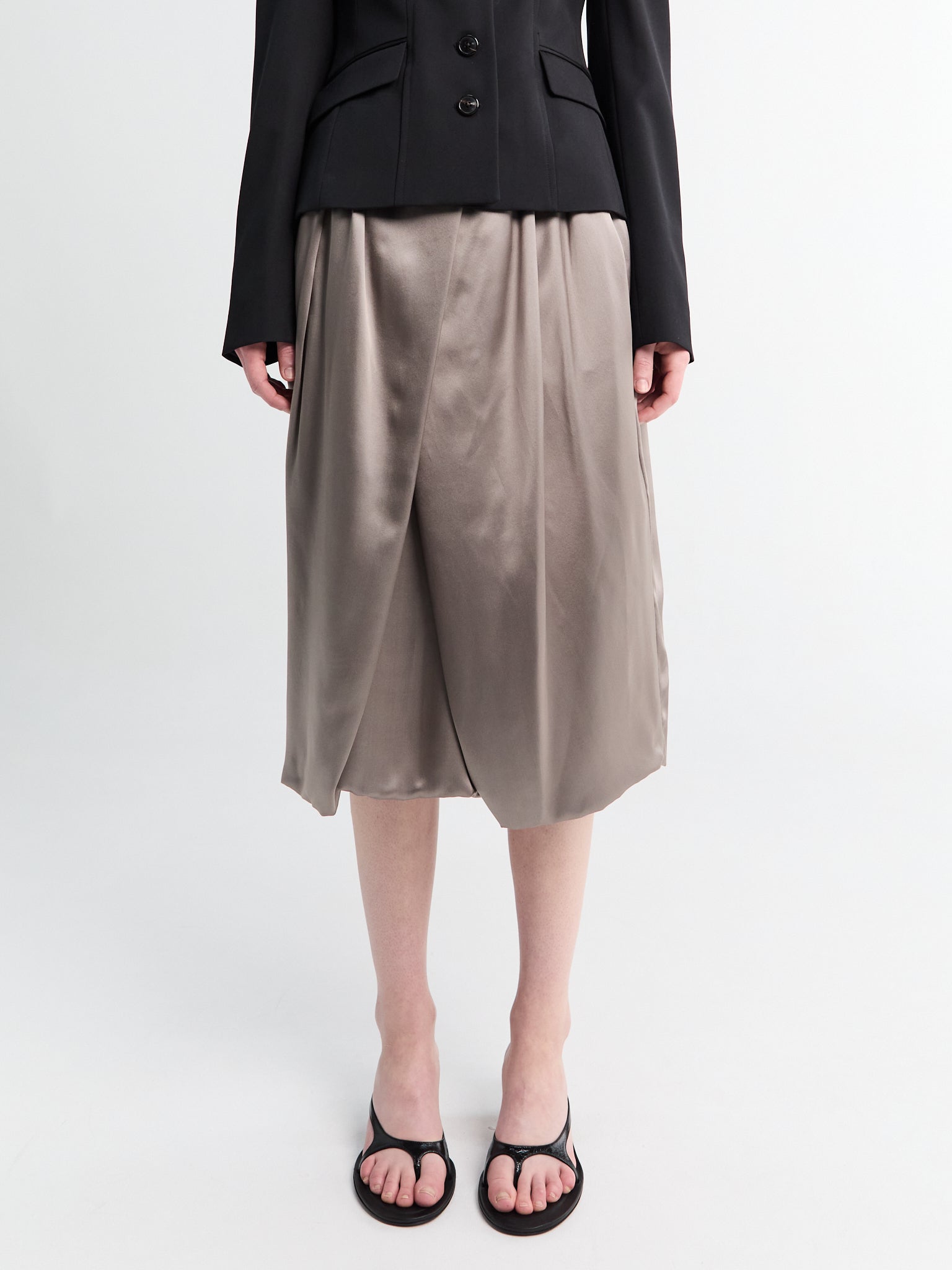 The Saronga Bis Skirt by Dries Van Noten is crafted from taupe silk. Its wrap construction drapes fluidly, creating an adjustable silhouette that finishes in an asymmetric hem.