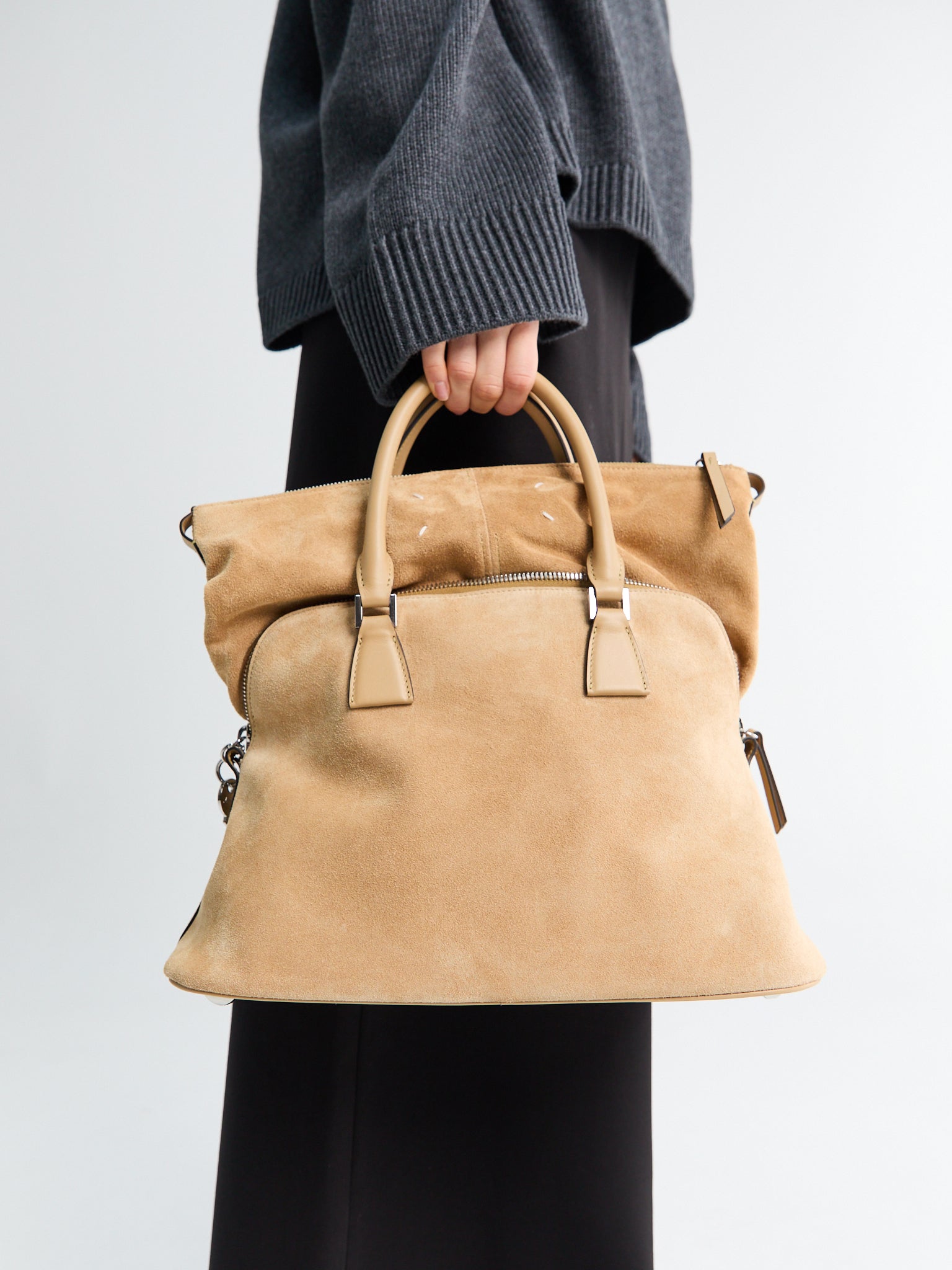 Maison Margiela's 5AC bag is crafted from soft suede leather, featuring a foldable lining that can be extended to display the numeric logo or tucked inside for a more streamlined silhouette. The versatile design is completed with top handles, a detachable strap, and the signature four-stitch moniker.