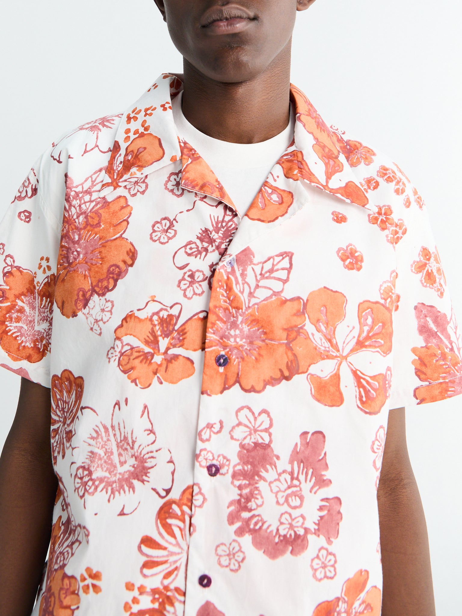 Crisp short-sleeved shirt featuring an elegant floral pattern.