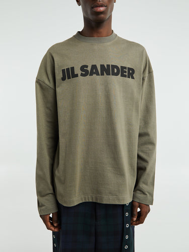 Jil Sander's Logo T-Shirt in Thyme Green is crafted in Italy from 100% cotton, it features a classic crew neck and ribbed collar, with the Jil Sander logo prominently printed on the front.