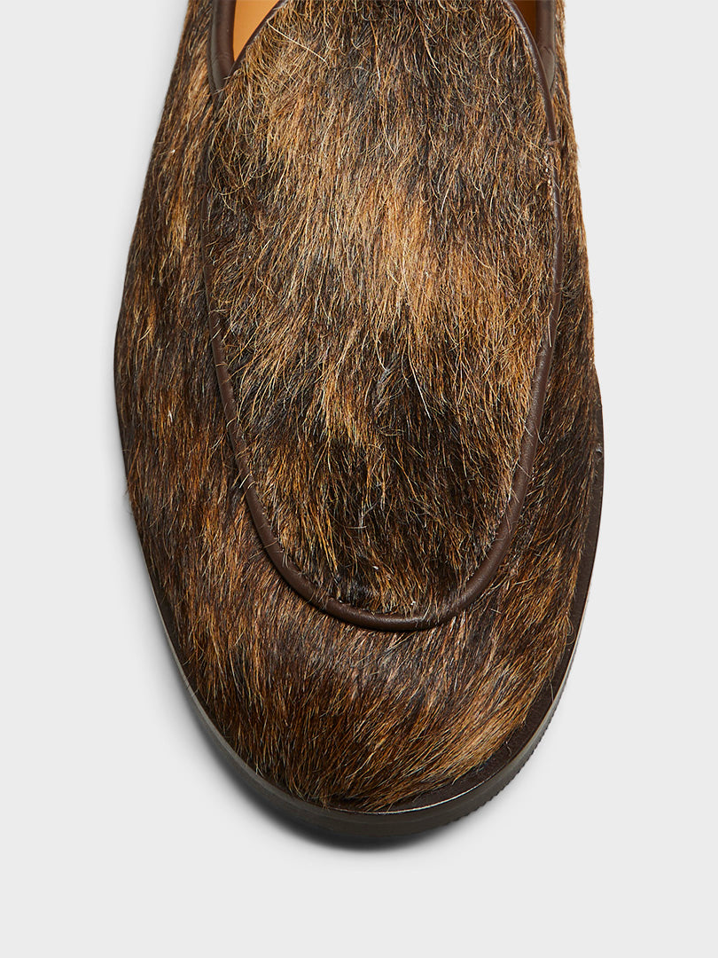 Slip-on loafers in natural hairy calf with leather piping and soft leather lining. Black cemented sole, pre-rubberized. Made in Portugal from Italian leather. Dust bag included.