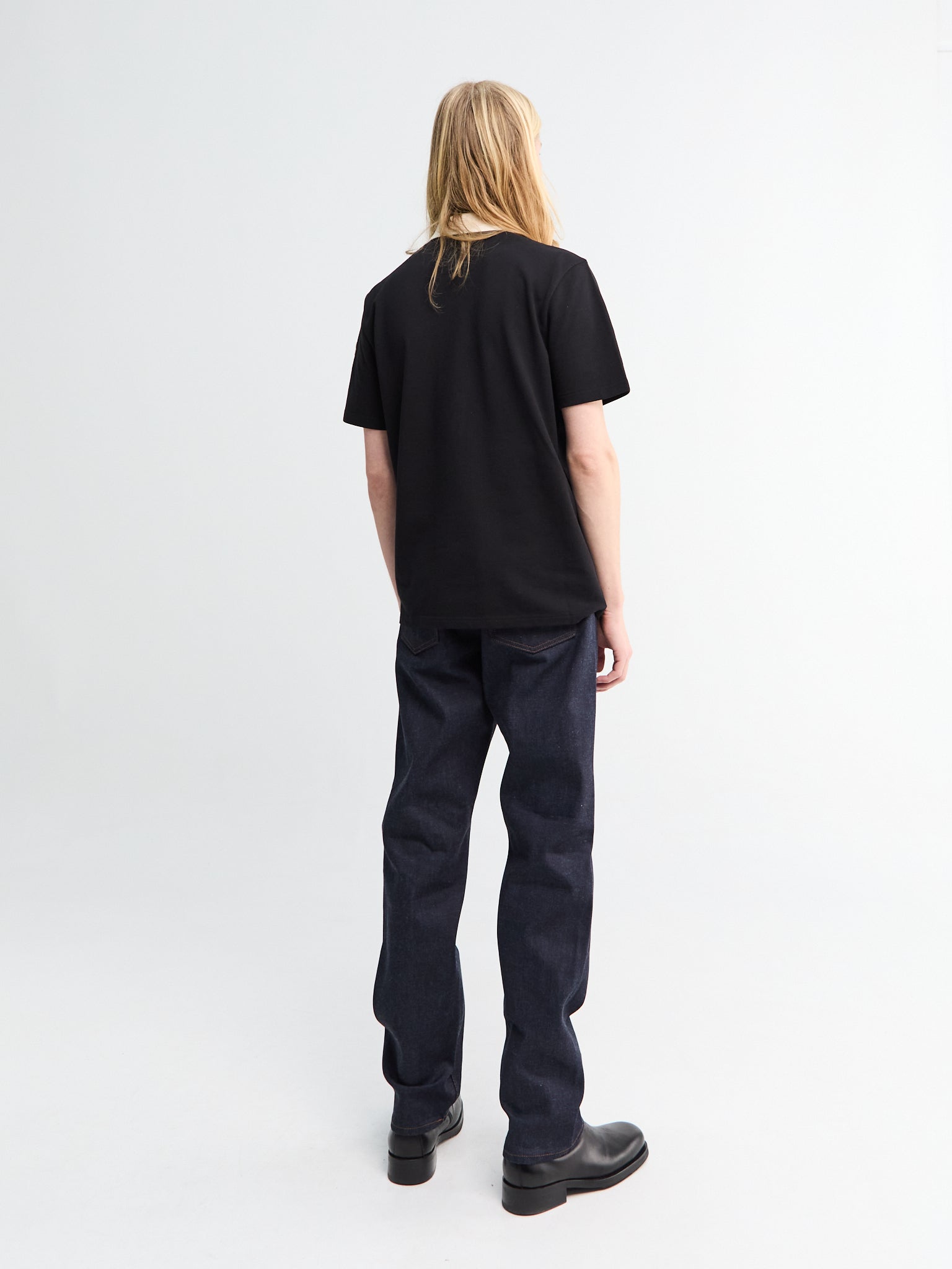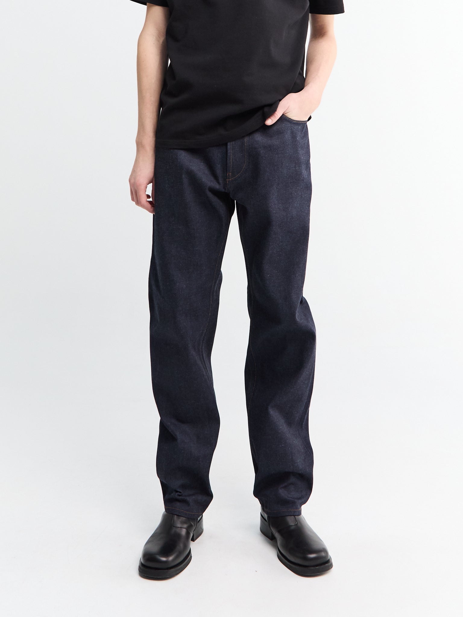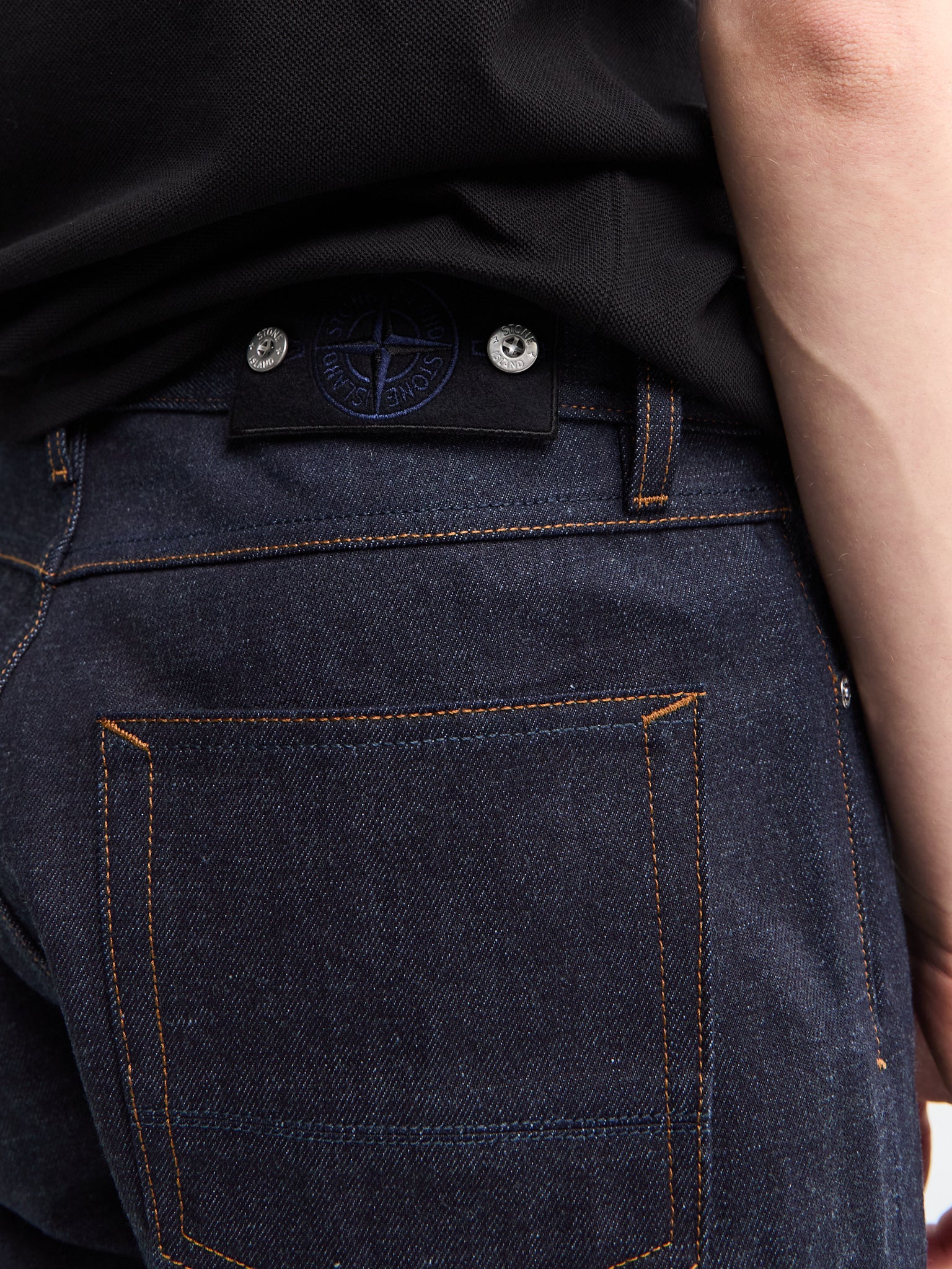 Five-pocket jeans crafted from 13oz Japanese selvedge denim made with indigo-dyed cotton. The back pockets are reinforced for durability, and the Stone Island Denim Research badge is prominently displayed.