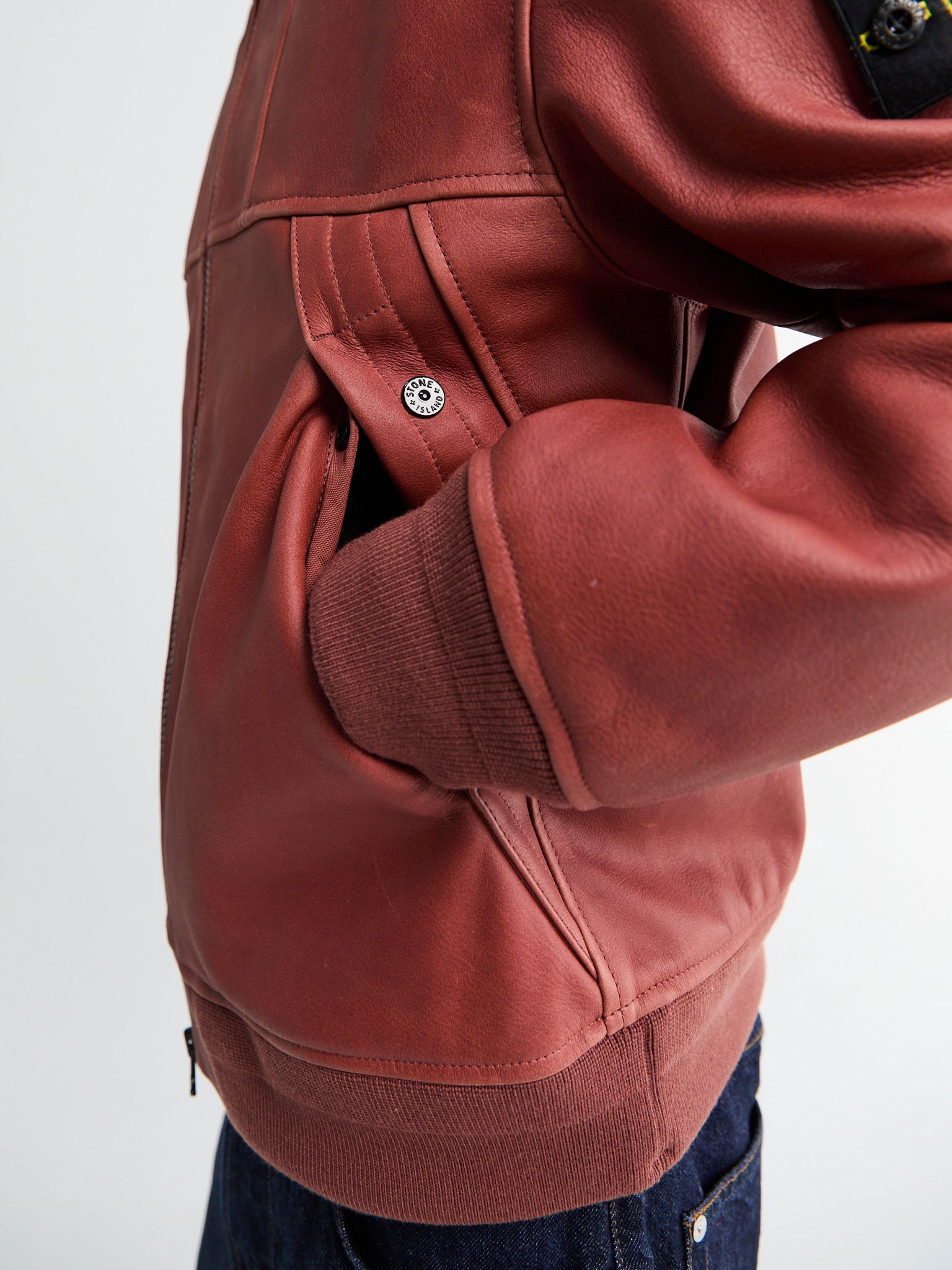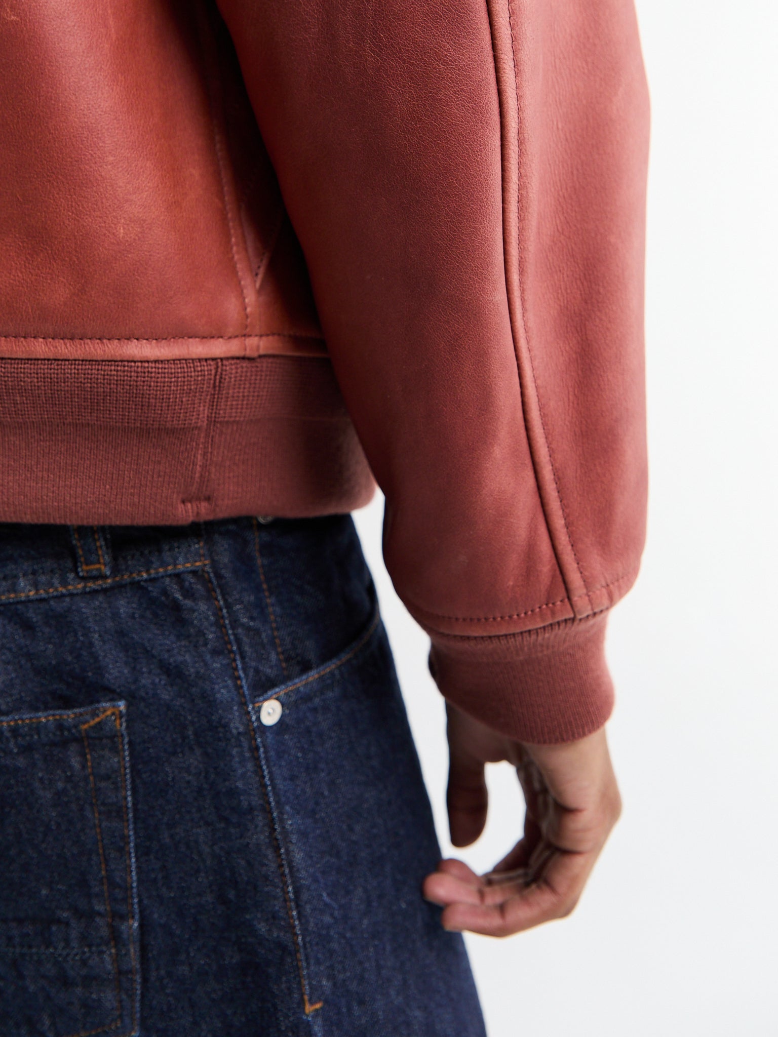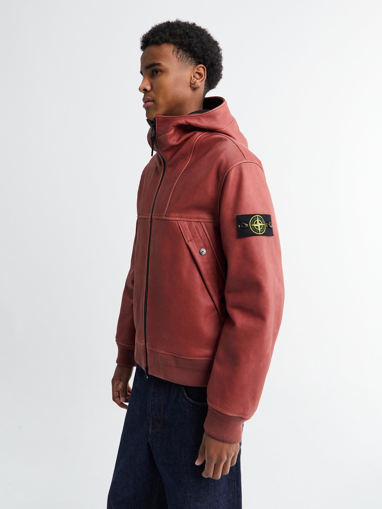 A brick red jacket made from coated technical fabric and garment-dyed for a distinct finish. The jacket includes a hood, full-zip front, and flap pockets. Ribbed trims are at the cuffs and hem.