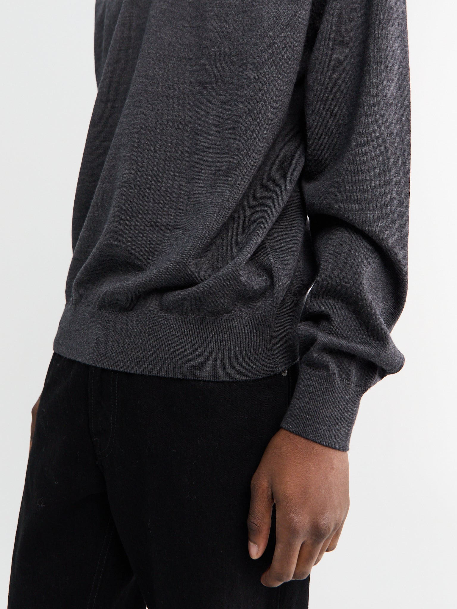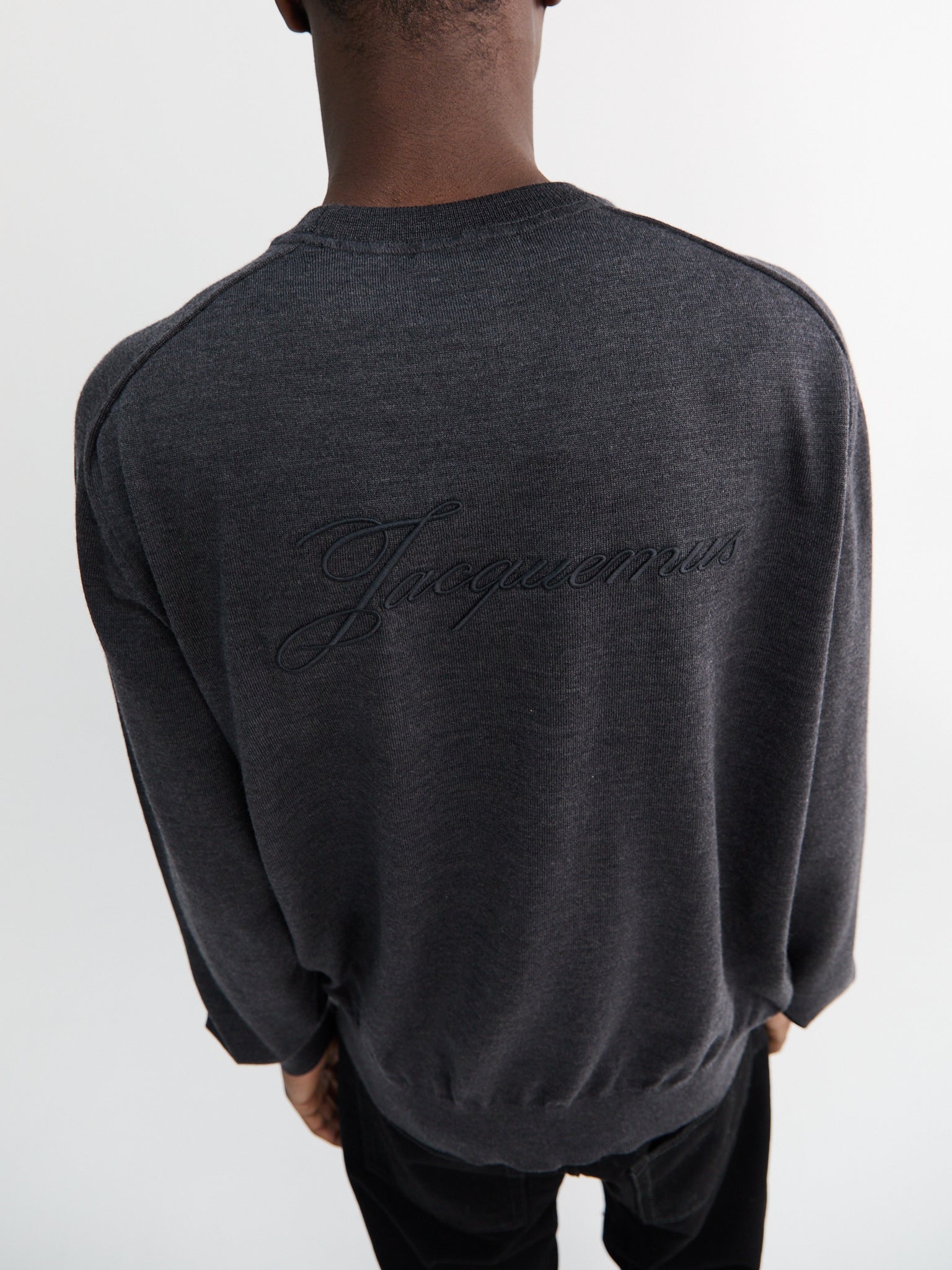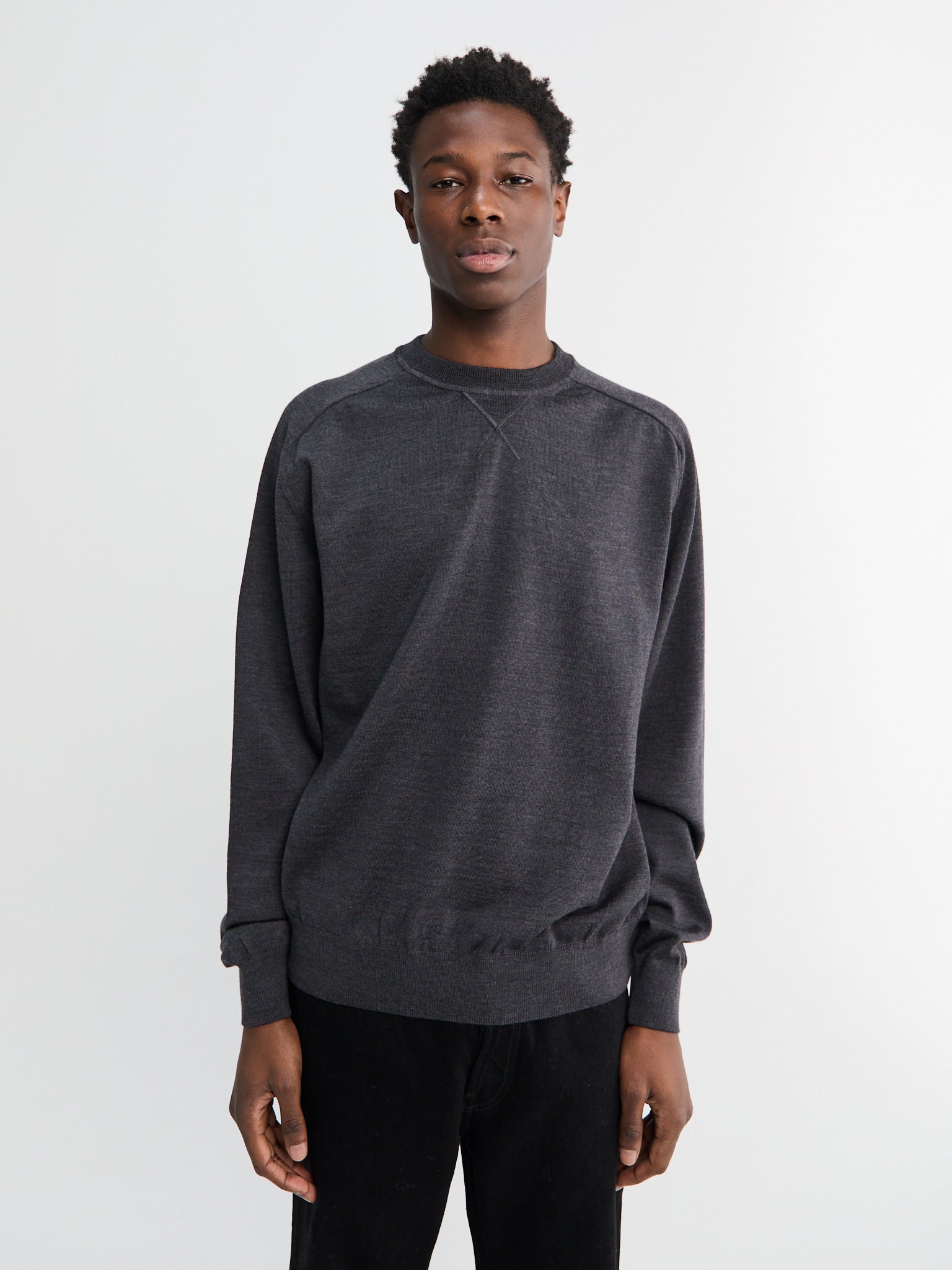 The Brode sweatshirt in charcoal gray features an embroidered logo, ribbed cuffs, and a round neckline.