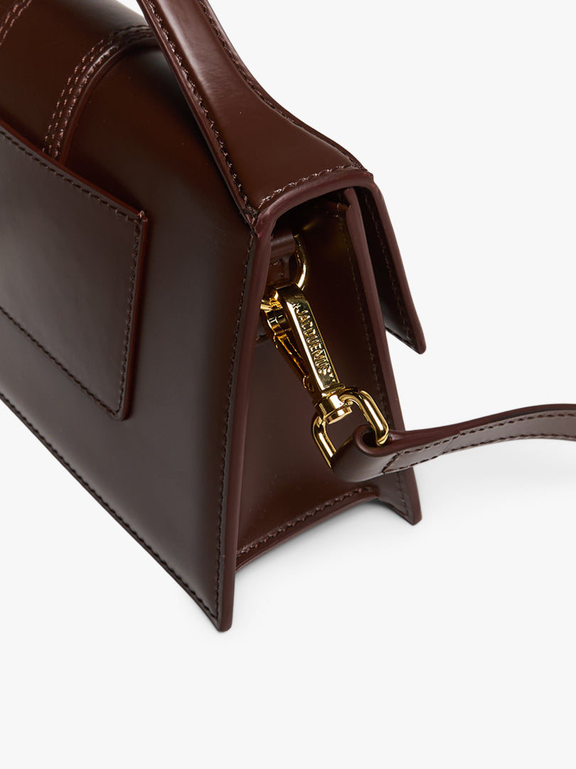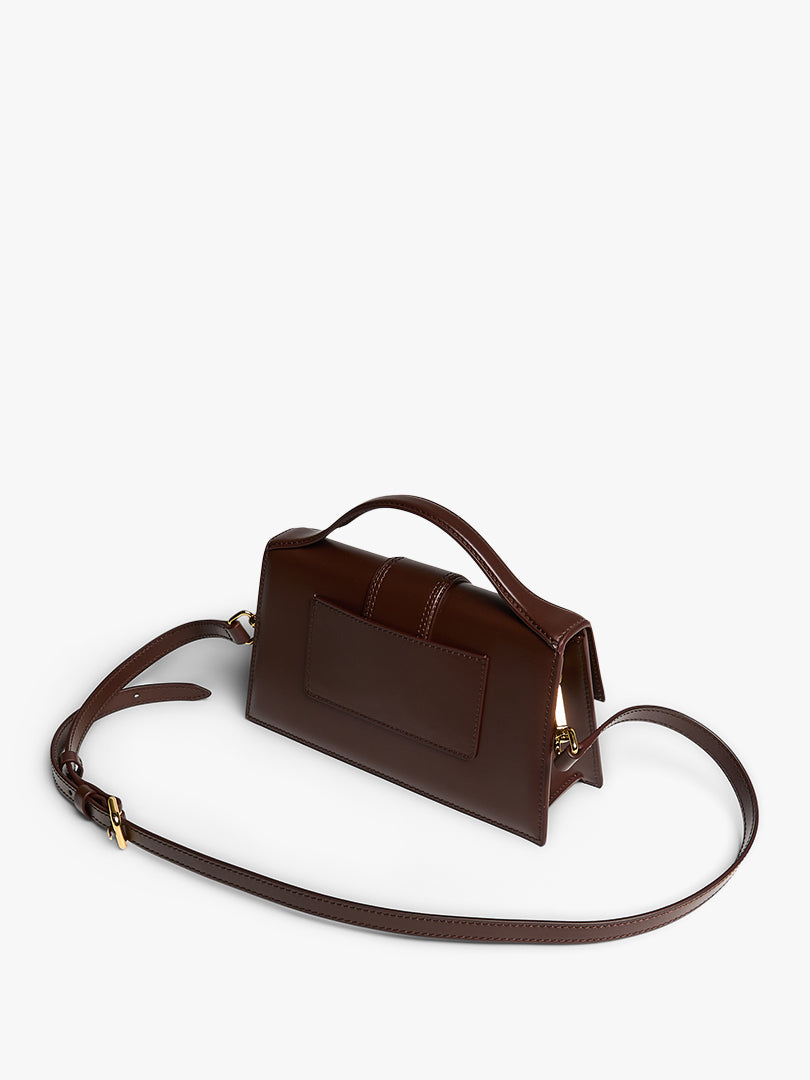 This handbag features a structured top handle and a detachable shoulder strap for versatile styling. It is finished with a gold toned logo and a classic flap closure for a refined look.