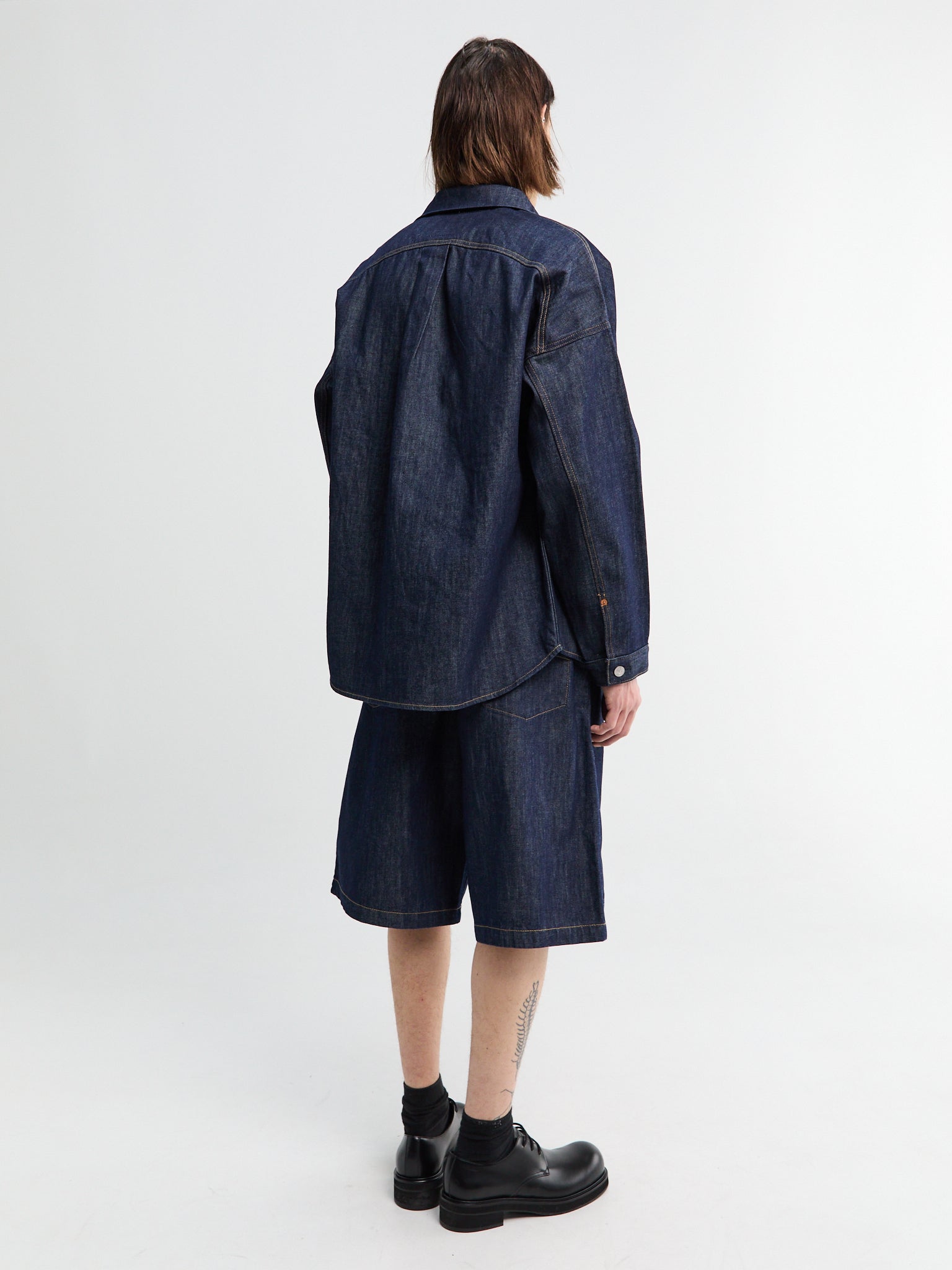 Made from dark indigo denim with a loose, below-knee fit, they are built for comfort and movement.