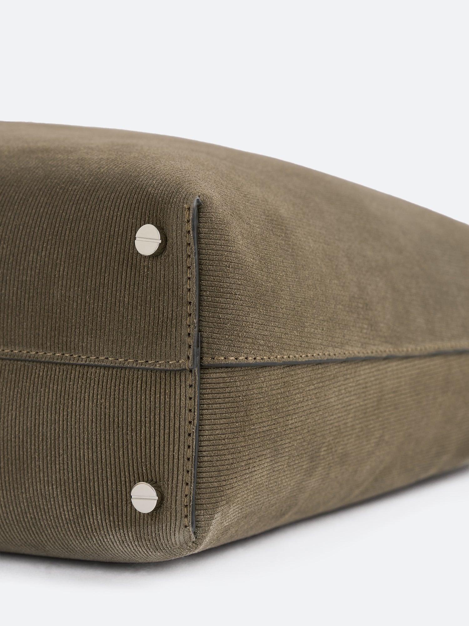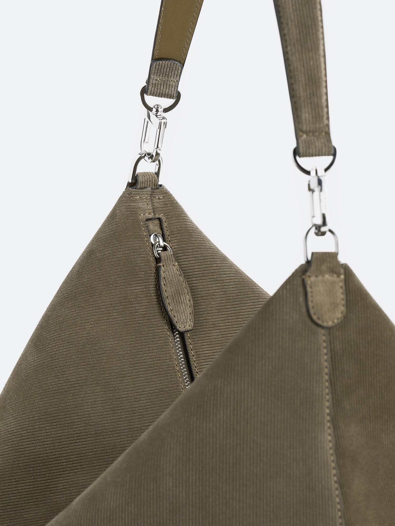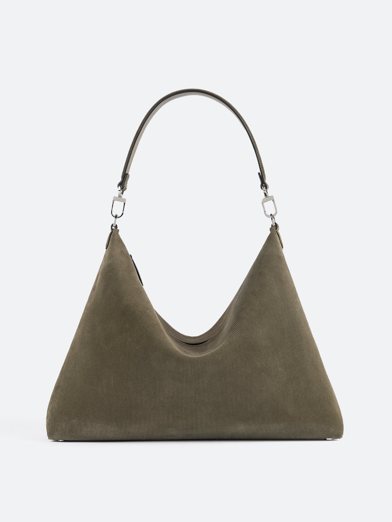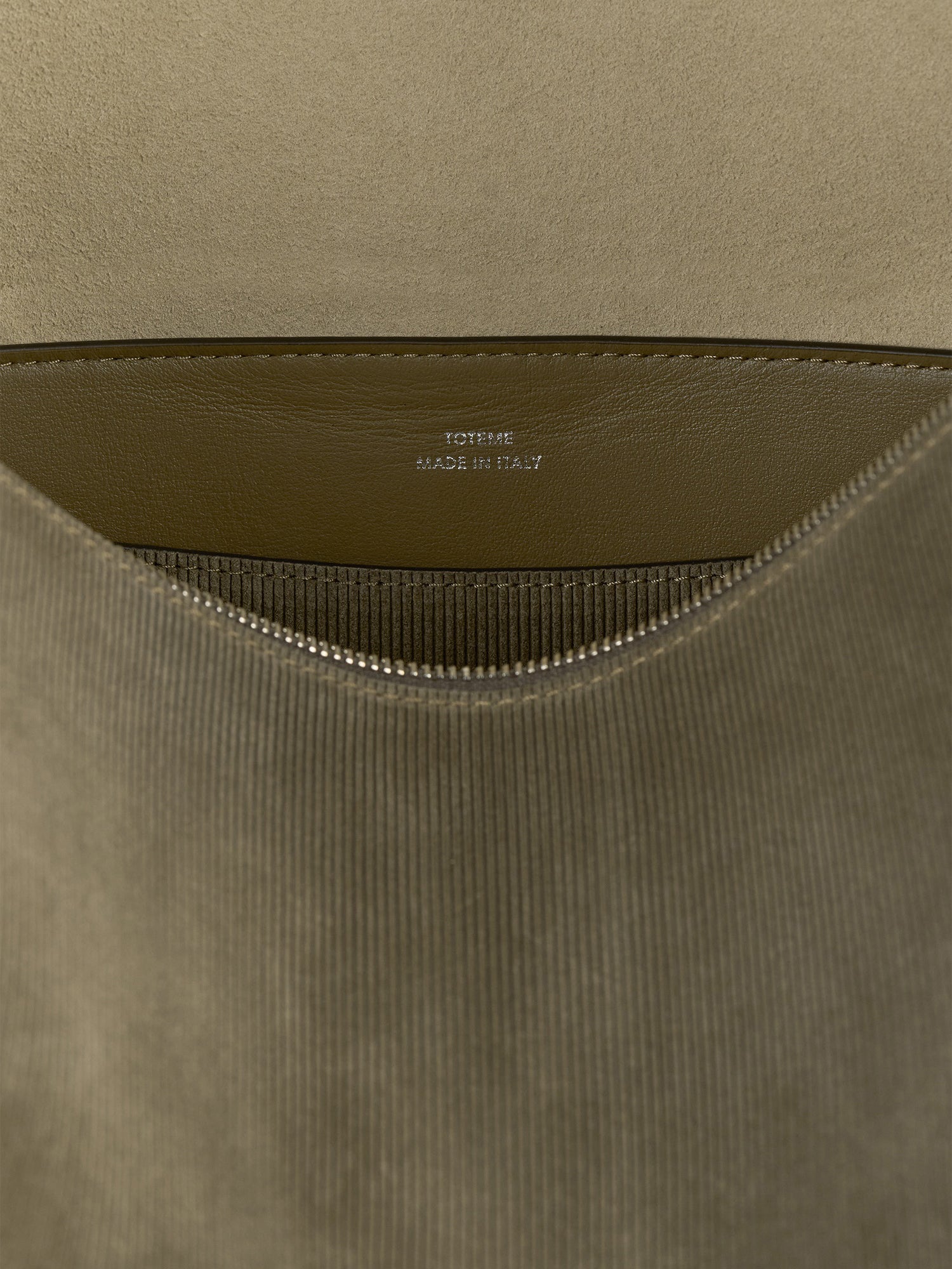 This bag is made from suede with a curved opening for shoulder carry. The interior features a zipped compartment and slip pockets for storage