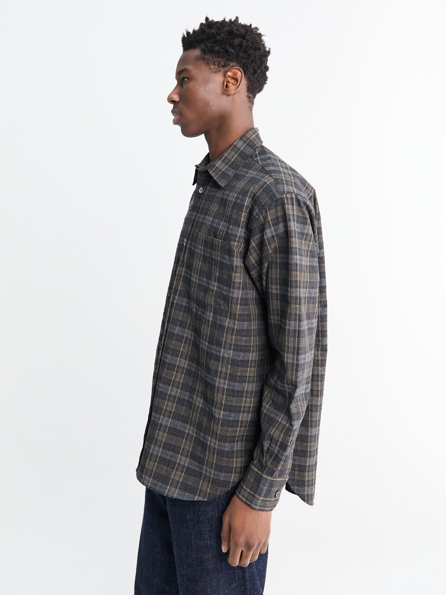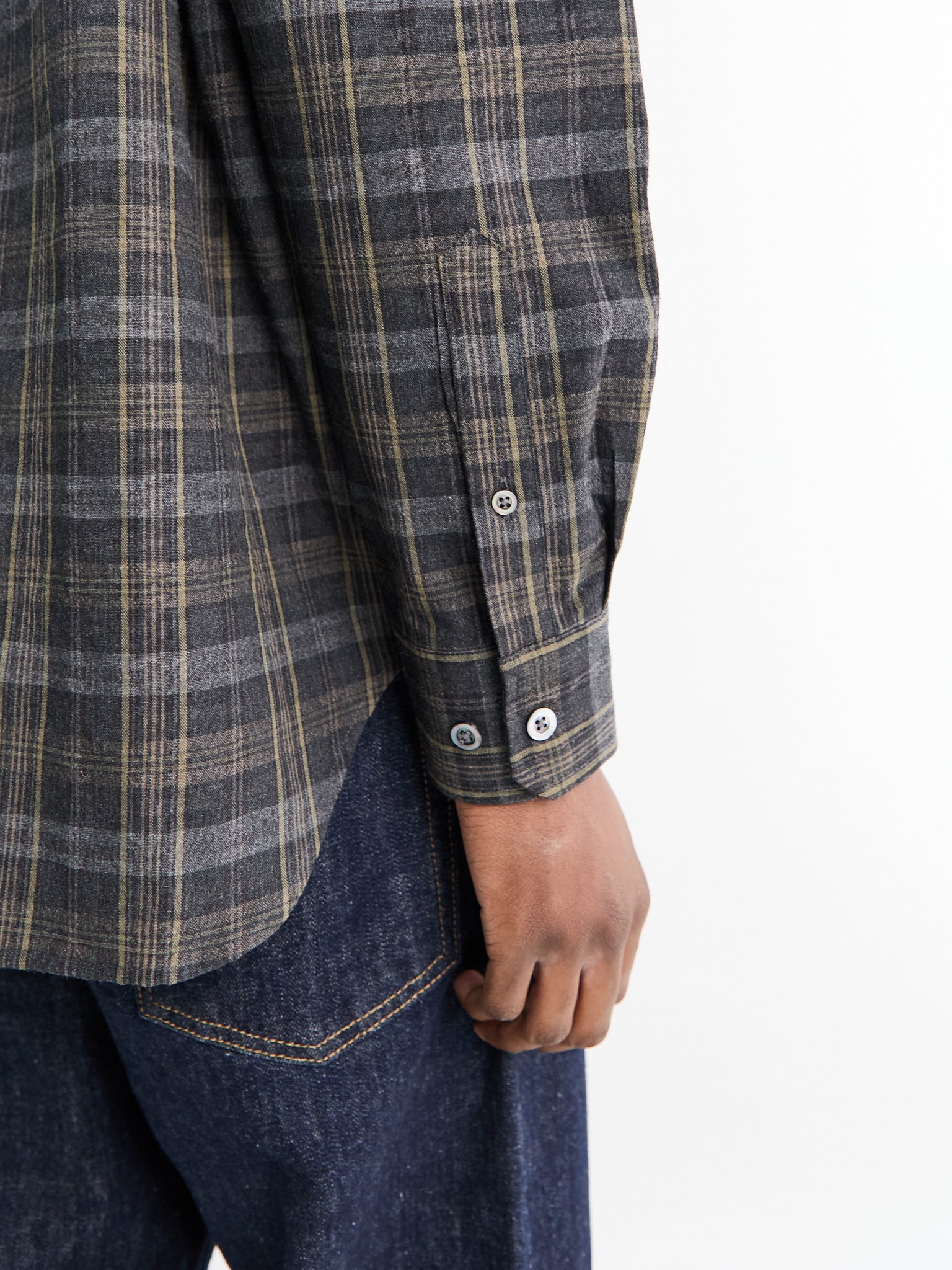 An oversized fitting shirt, with a wider cut body. This flannel checked shirt is constructed in a wool blend Italian fabric with a slight crinkled appearance. This shirt is finished with a chest pocket and mother of pearl buttons