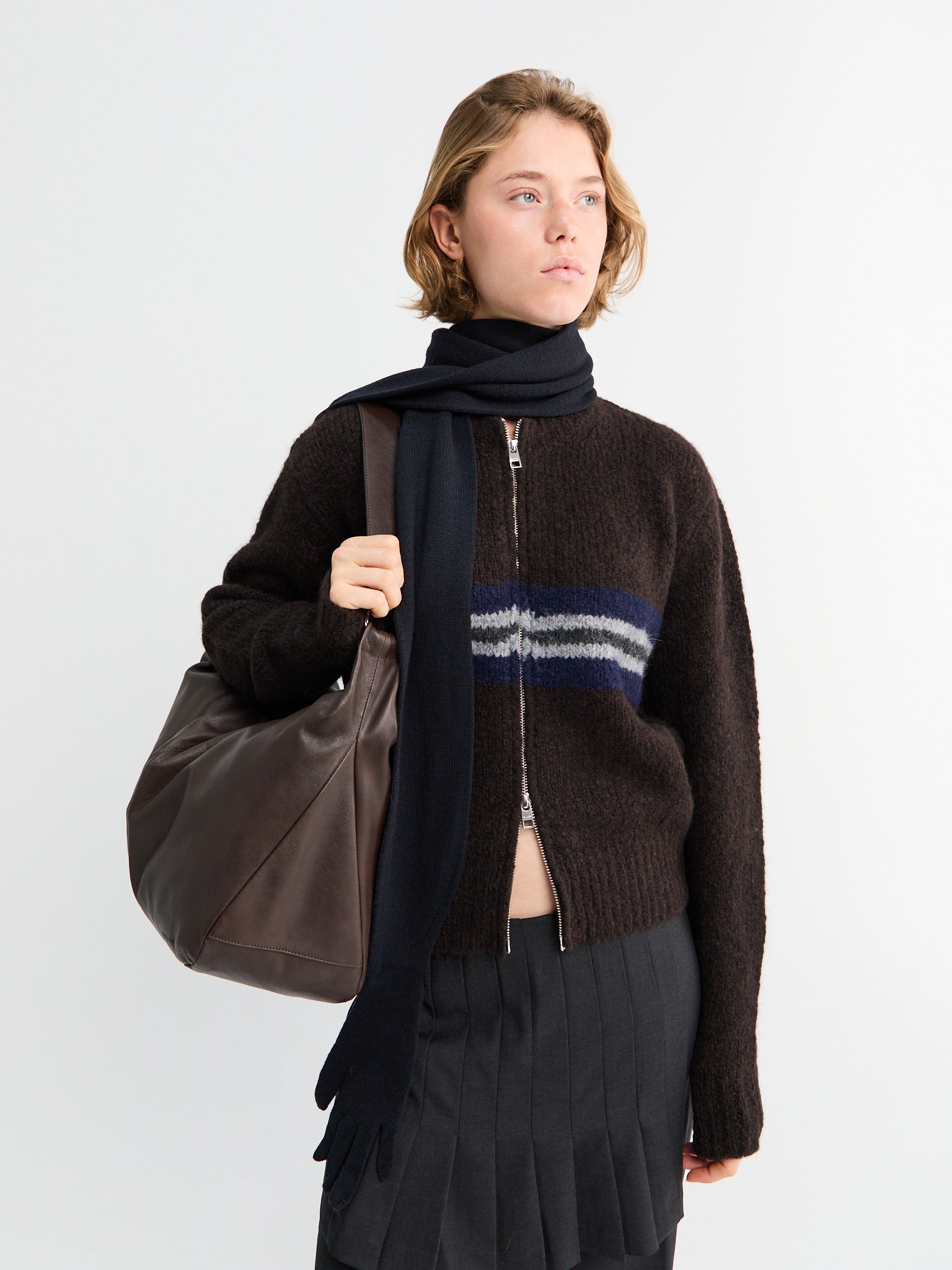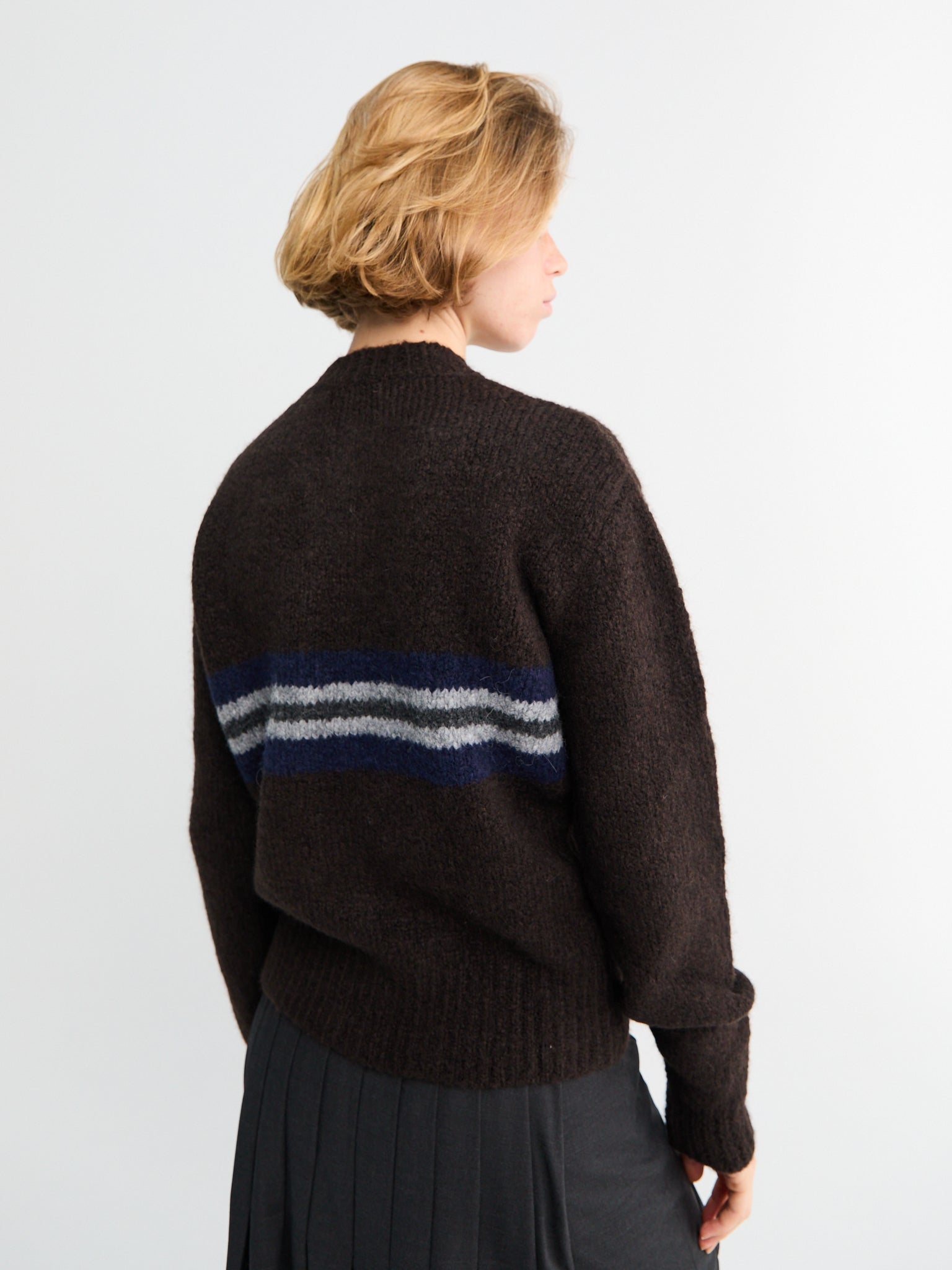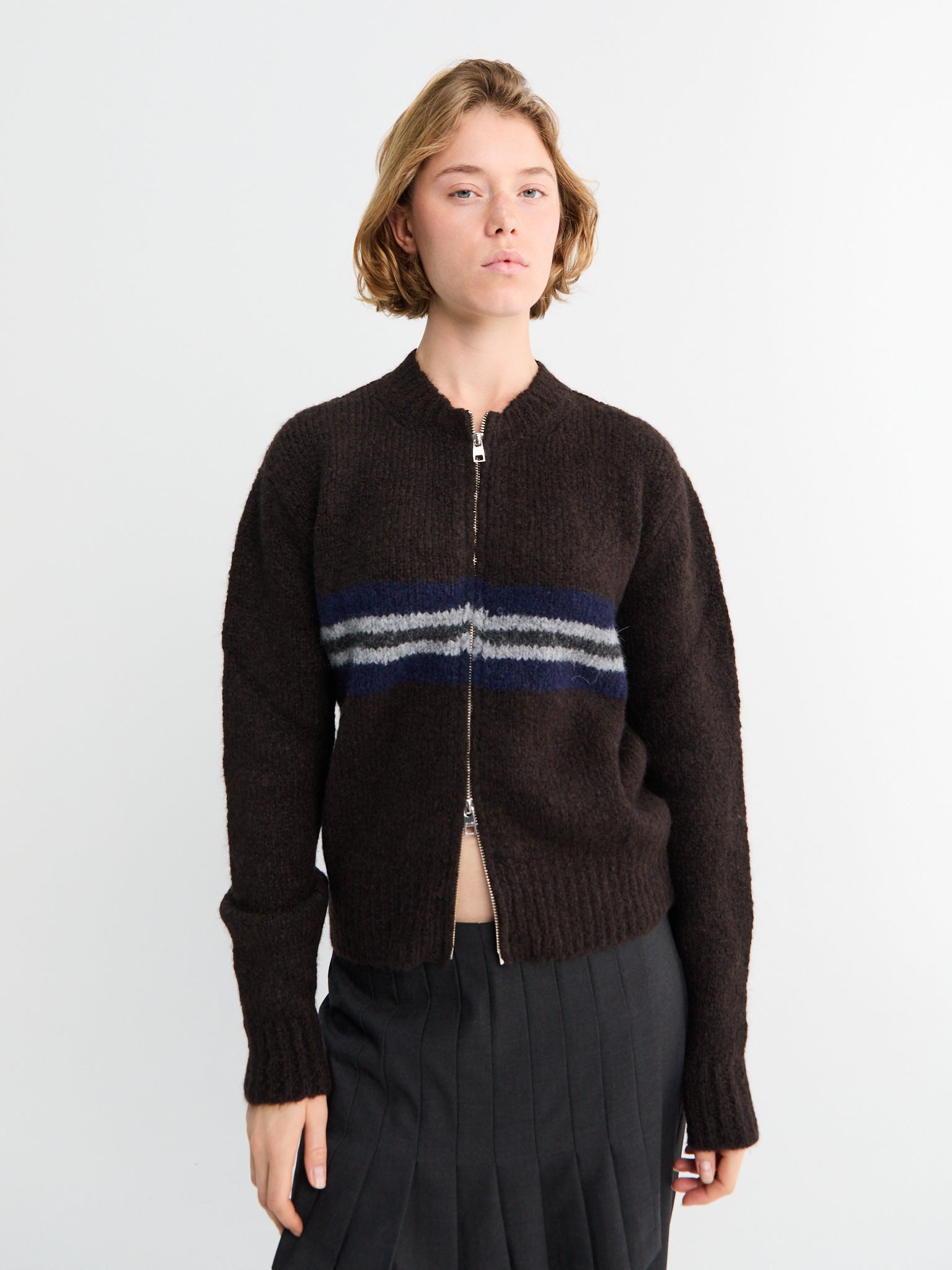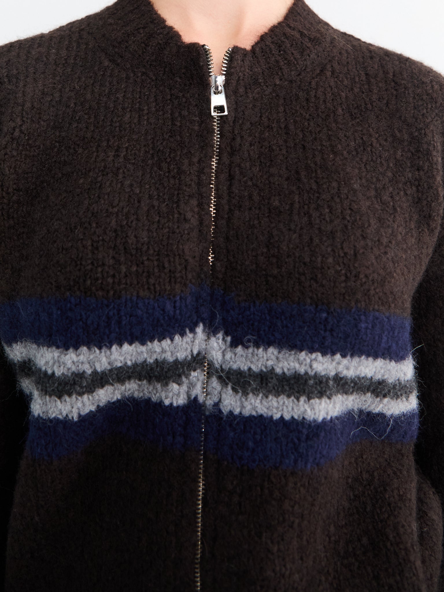 This knitted cardigan features a classic striped front panel and a personalized zipper. Made from thick, warm yarn, it offers comfort