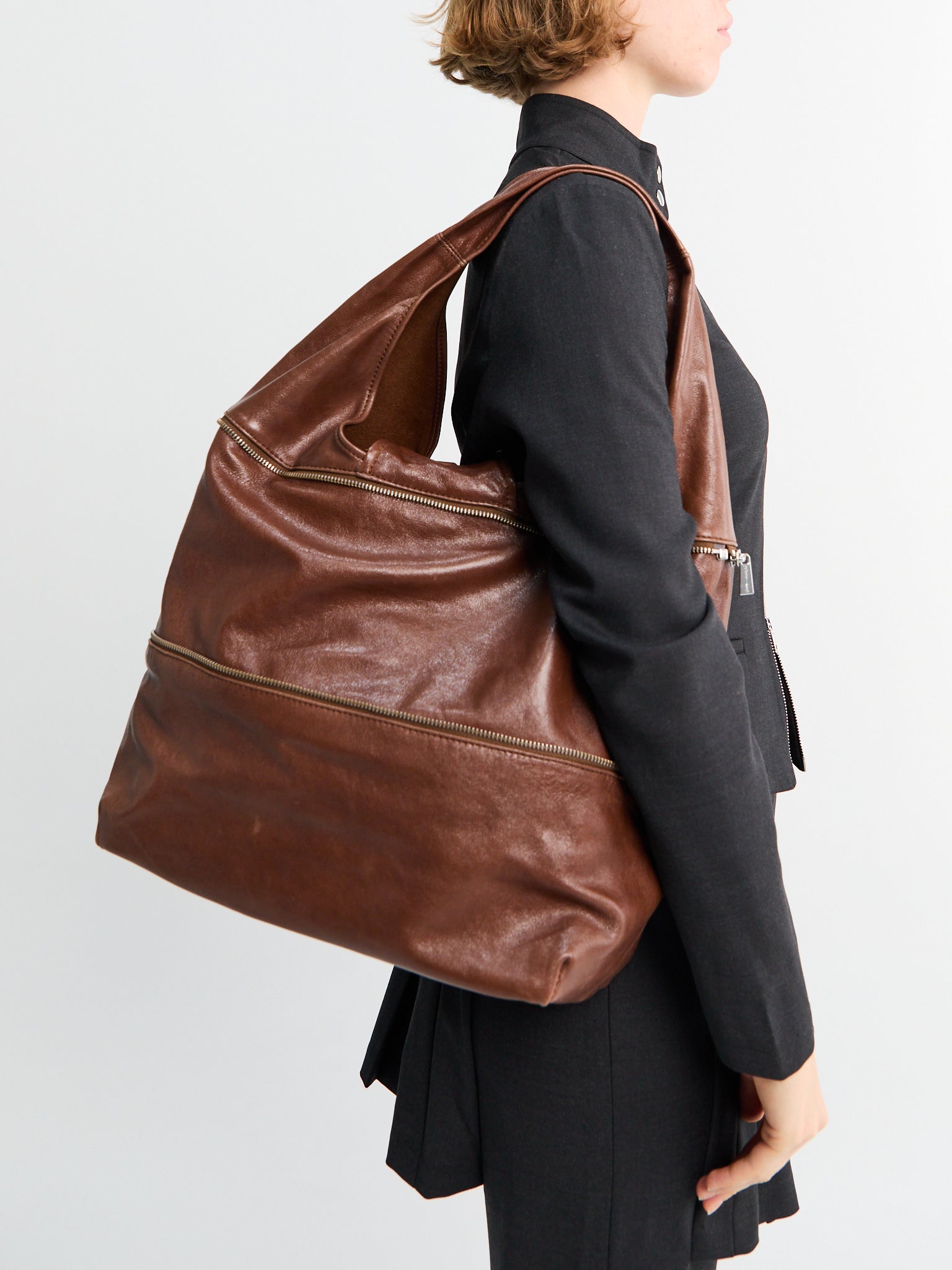 This bucket-style shoulder bag in brown features an unlined interior with a leather pocket. It can be transformed into a smaller handbag by closing the visible zipper, offering versatility and practical use