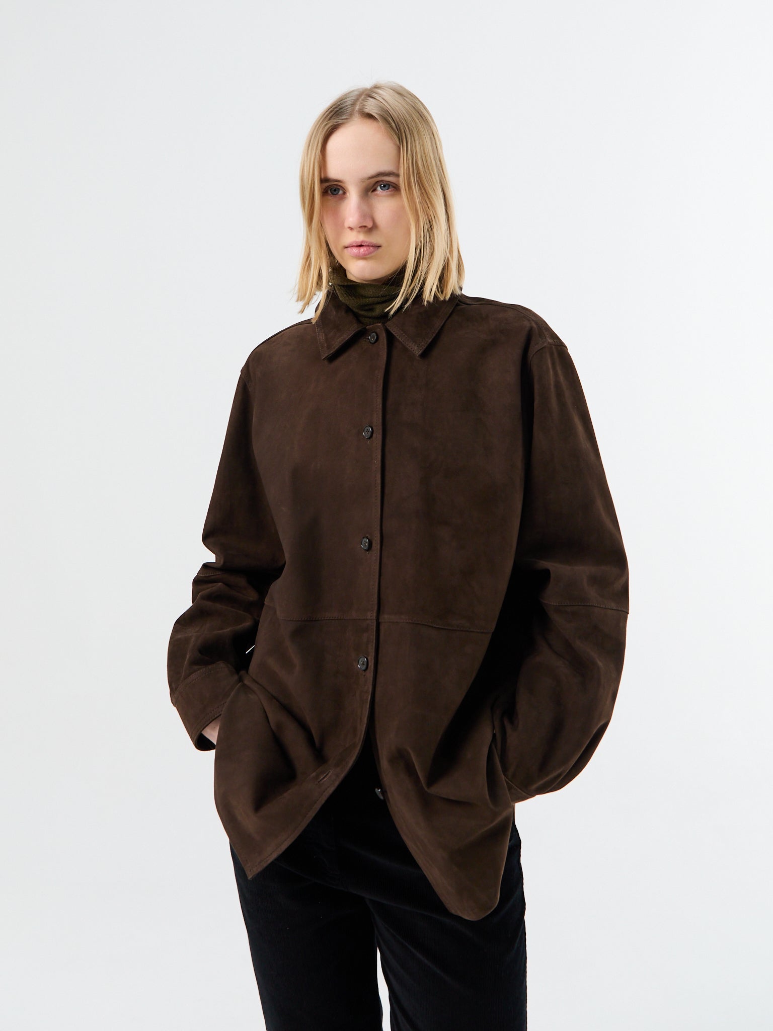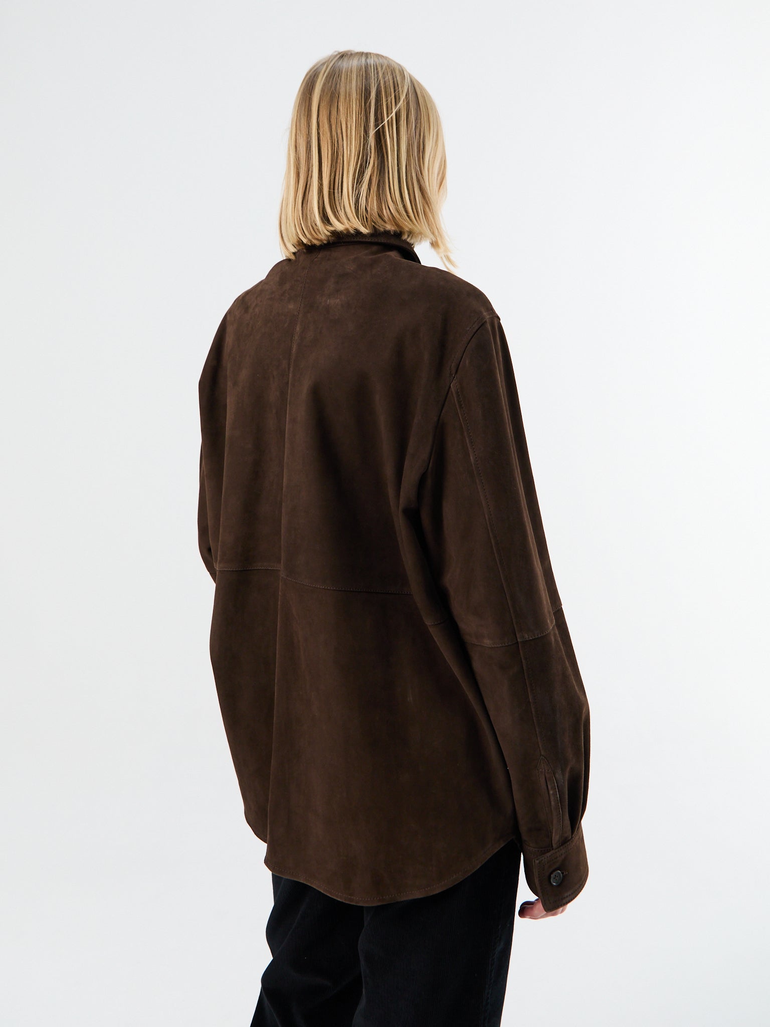 This overshirt is cut from soft suede and designed with an oversized silhouette. The fit is defined by dropped shoulders, while a point collar and discreet side pockets complete the piece.