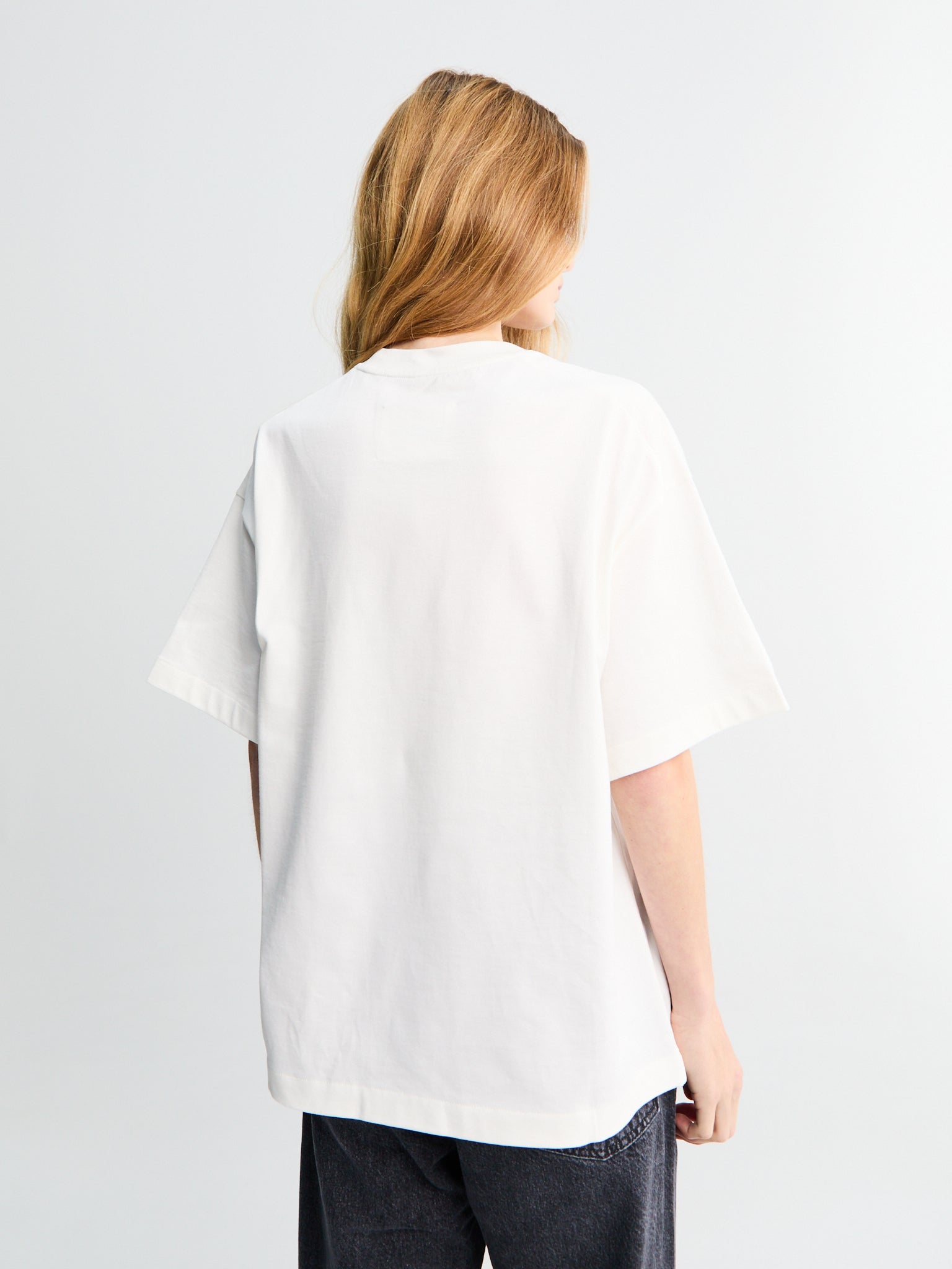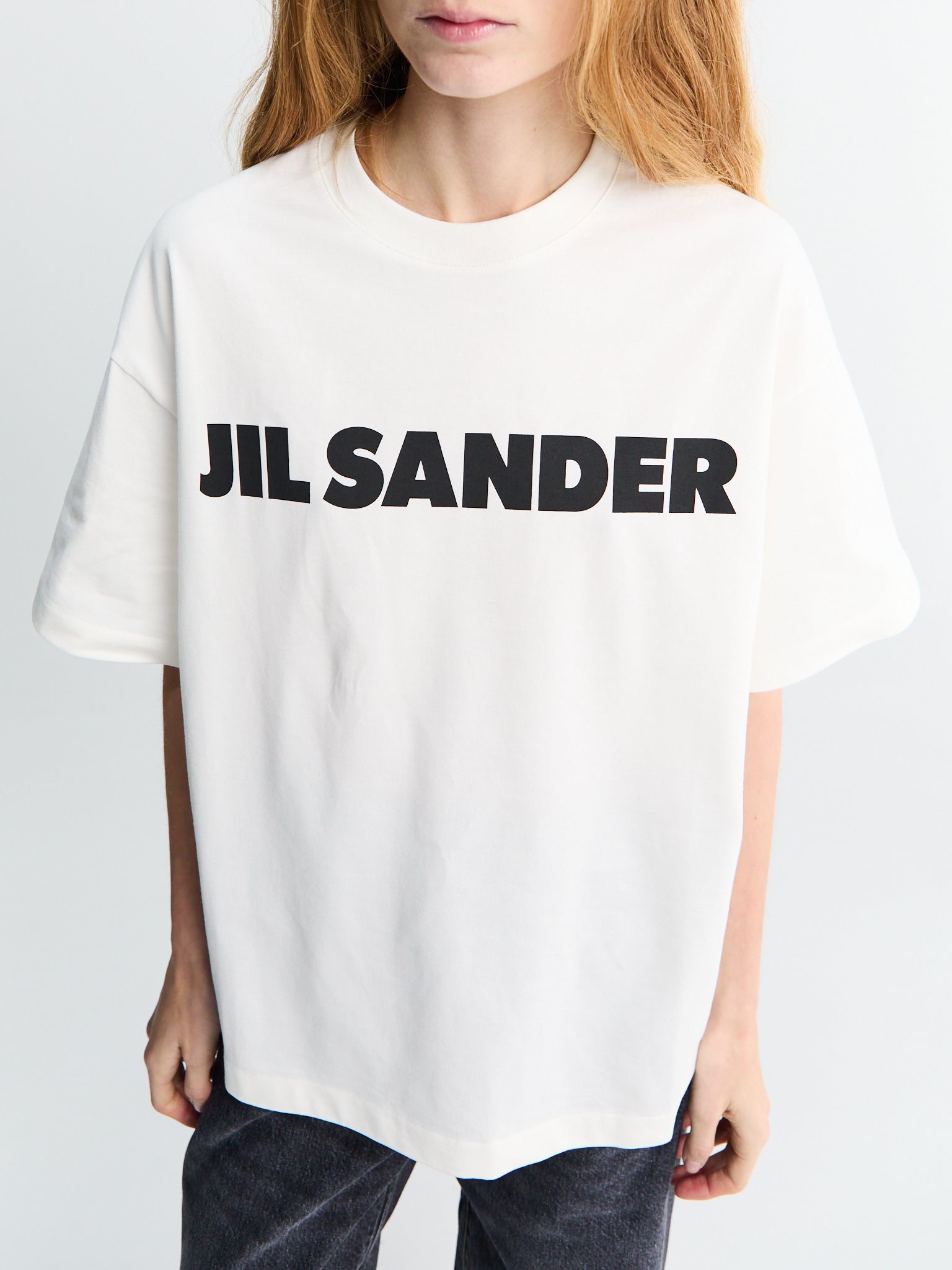 An oversized white t-shirt in light-weight cotton jersey with a boxy silhouette and dropped shoulders. Showcasing the iconic Jil Sander logo, this relaxed-fit essential delivers contemporary style with comfortable, laid-back appeal.