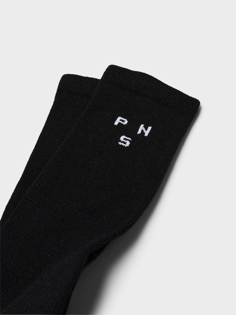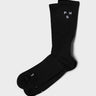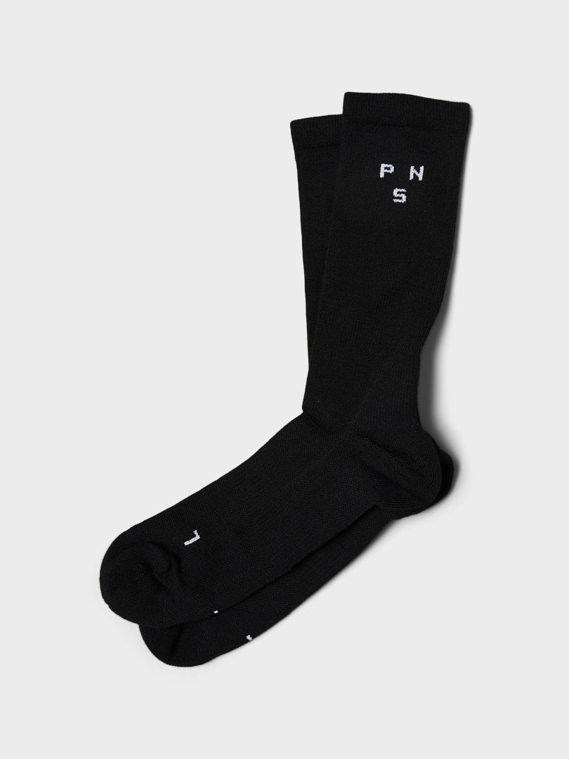 Merino wool socks in black with nylon reinforcement at heel and toes to prevent tear. L-shaped construction with fitted toe box for comfort. Insulates when wet, reduces odours through antimicrobial treatment, and maintains compression through washing