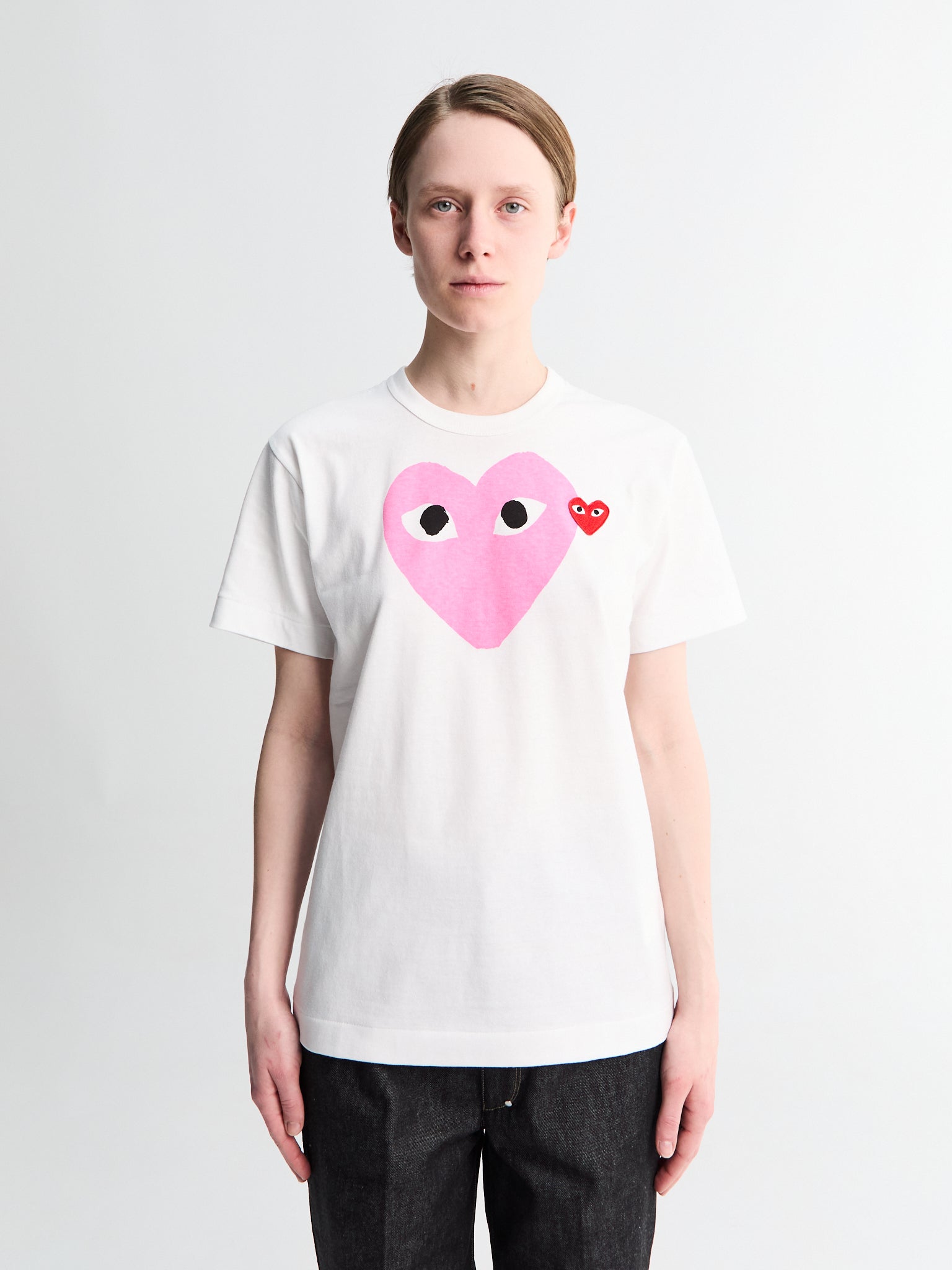 White t-shirt with pink logo. Made from cotton jersey. Features a pink and red heart motif as the main logo design.