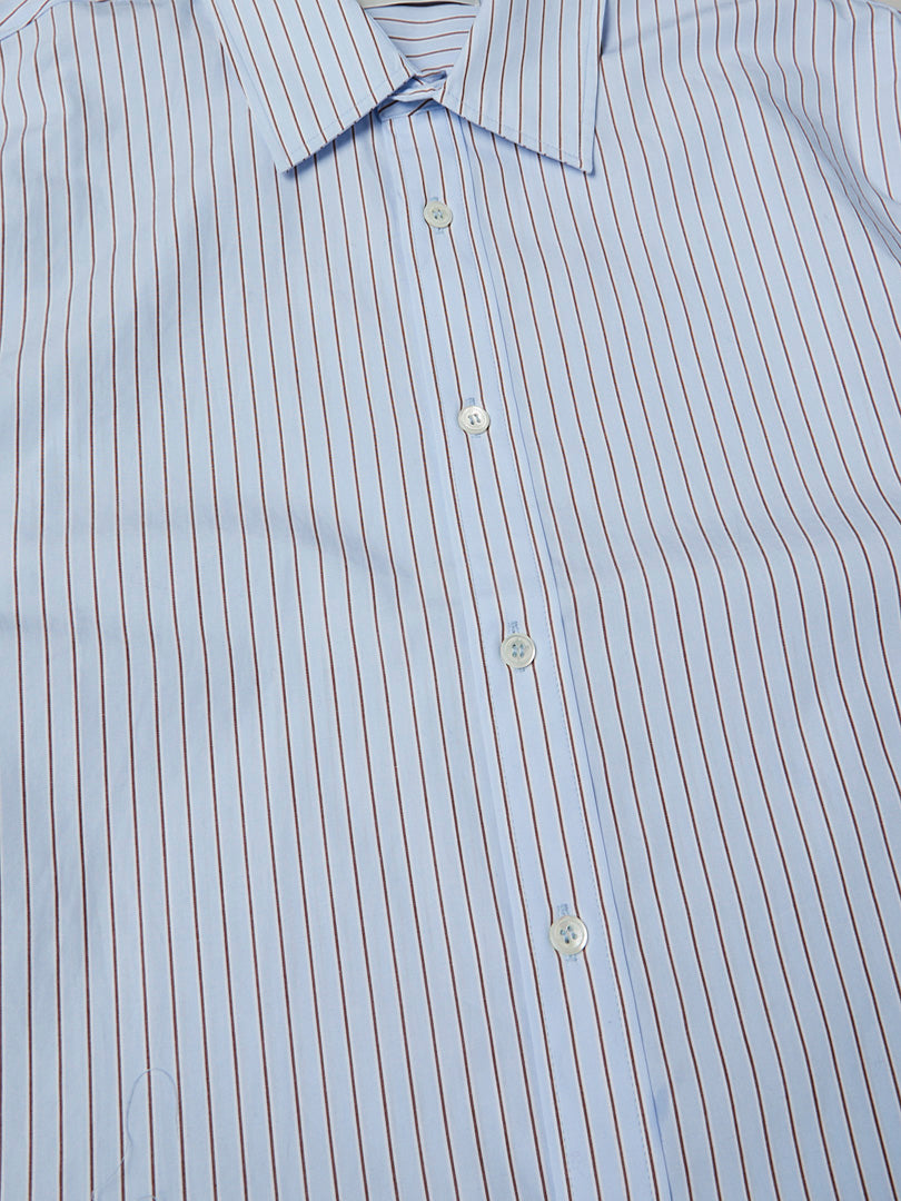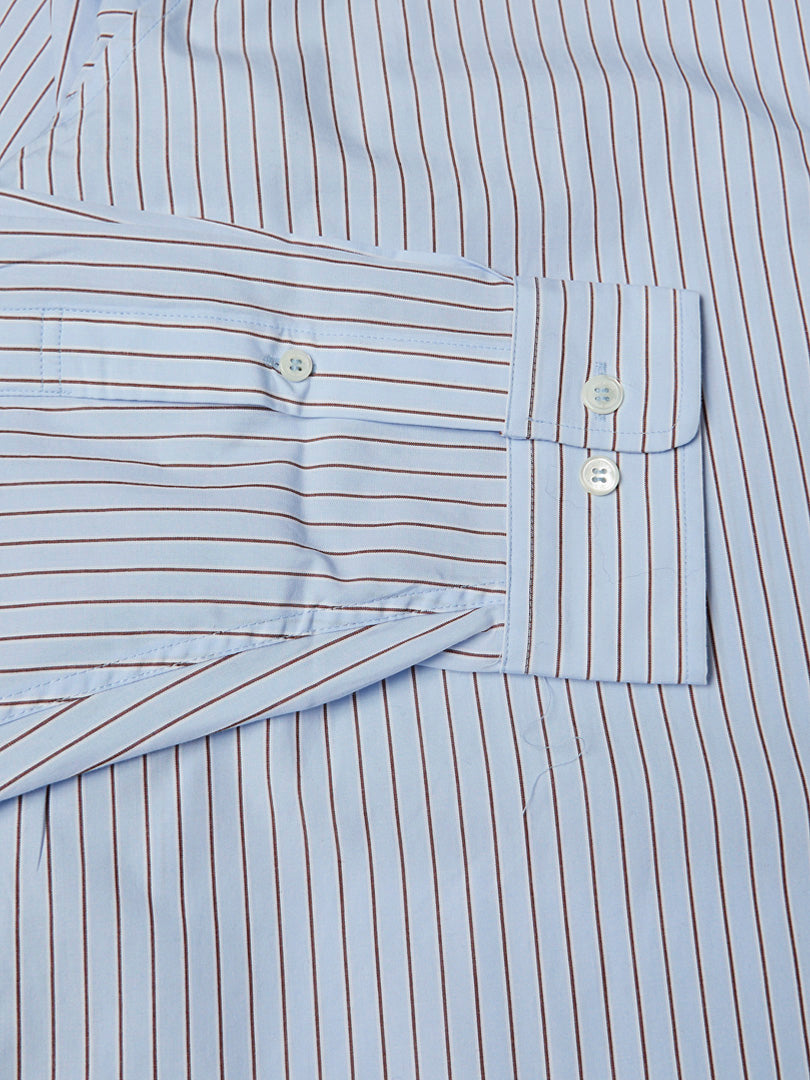 This shirt is crafted from crisp cotton for a relaxed, informal silhouette. Presented in a blue and brown stripe, the design is finished with a point collar and buttoned cuffs.